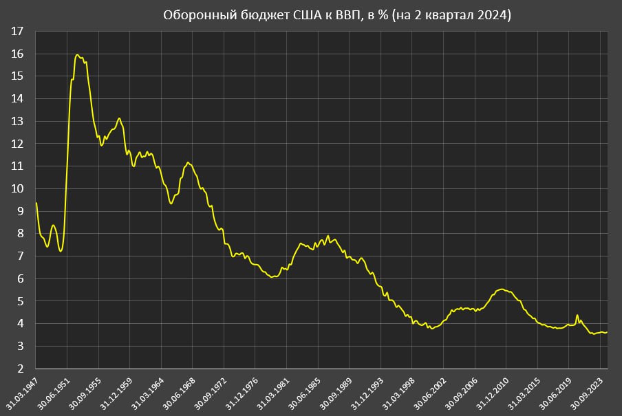 Доля расходов на оборону в 2024 достигла минимума с 1940 года без признаков расширения (3.6% от ВВП на 2кв24).
