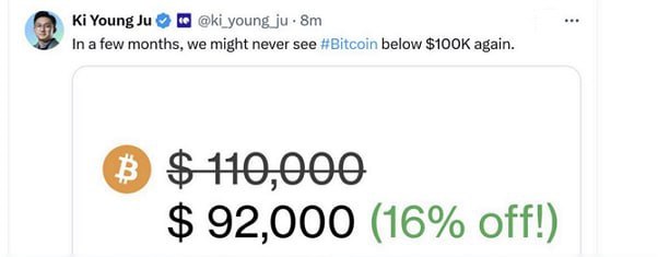 CEO CryptoQuant сравнил текущее падение биткоина с распродажей и считает, что уже через несколько месяцев мы, скорее всего, уже никогда не увидим биткоин ниже $100 000.