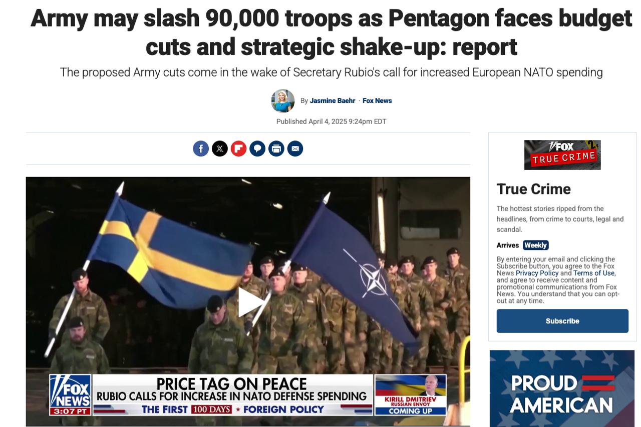 ▪️Министр обороны Пит Хегсет по поручению Трампа продвигает план по урезанию оборонного бюджета на 8%. При этом в Пентагоне заверяют: армия станет «компактной, мобильной и высокотехнологичной».