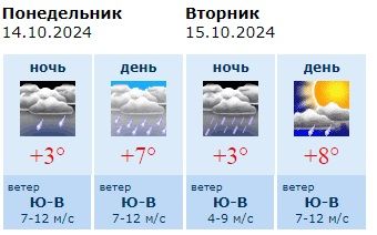 Небольшой дождь ожидается ночью 14 октября. Днём прогнозируют ливень, который продолжится и ночью 15 октября.