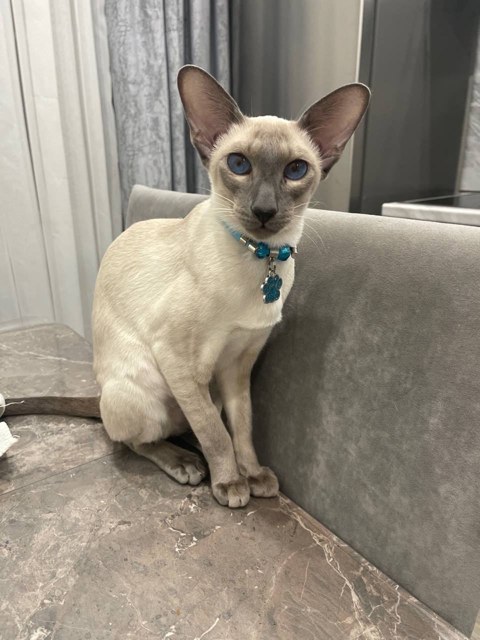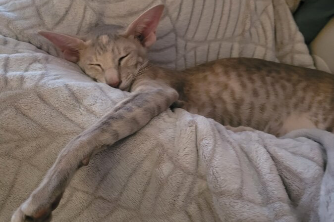У ориентальной кошки Персеи шерстинка к шерстинке. Как говорится, без сучка и задоринки. Ее хозяин отмечает, что она теплолюбива.