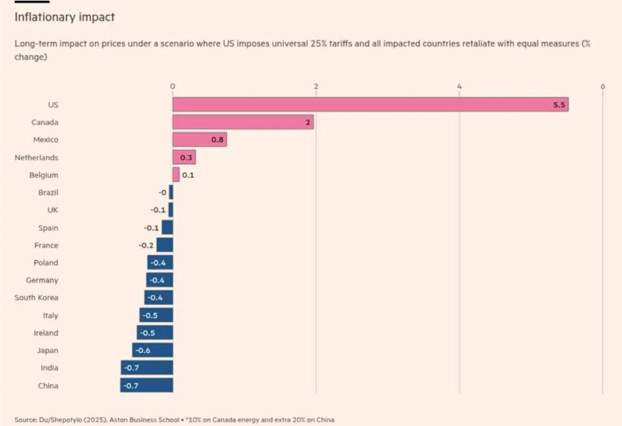🇺🇸США пострадают больше всего от своих новых пошлин, которыми Трамп обложил полмира. Цены вырастут на 5.5 процента — Financial Time