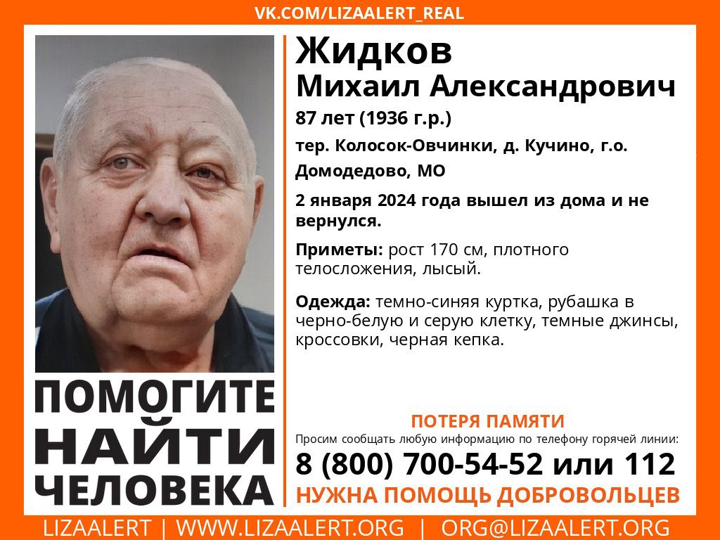 В Тульской области продолжается поиск 87-летнего жителя Подмосковья, Михаила Александровича Жидкова. Мужчина пропал на территории поселка Колосок-Овчинки, деревня Кучино, в городском округе Домодедово, Московская область.
