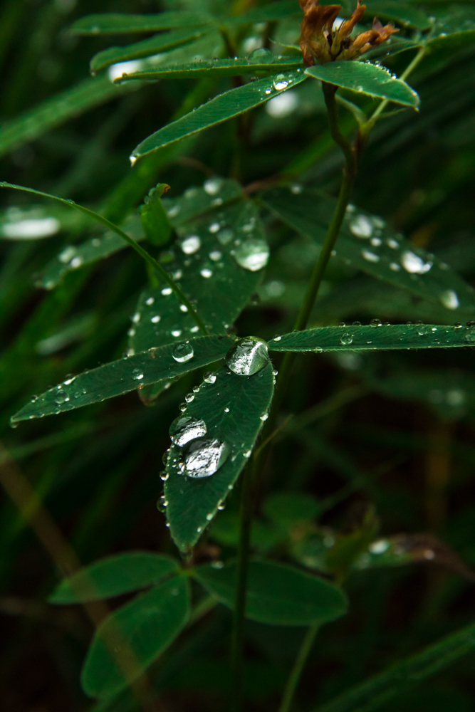 Мы нашли место кемпинга. У этой же дороги. Больше часа брат разводил костёр из сырых веток. И да, он это сделал! Пока он играл с огнем, я делала красивые фотографии травы: изумрудная трава с россыпью бриллиантов на листочках.