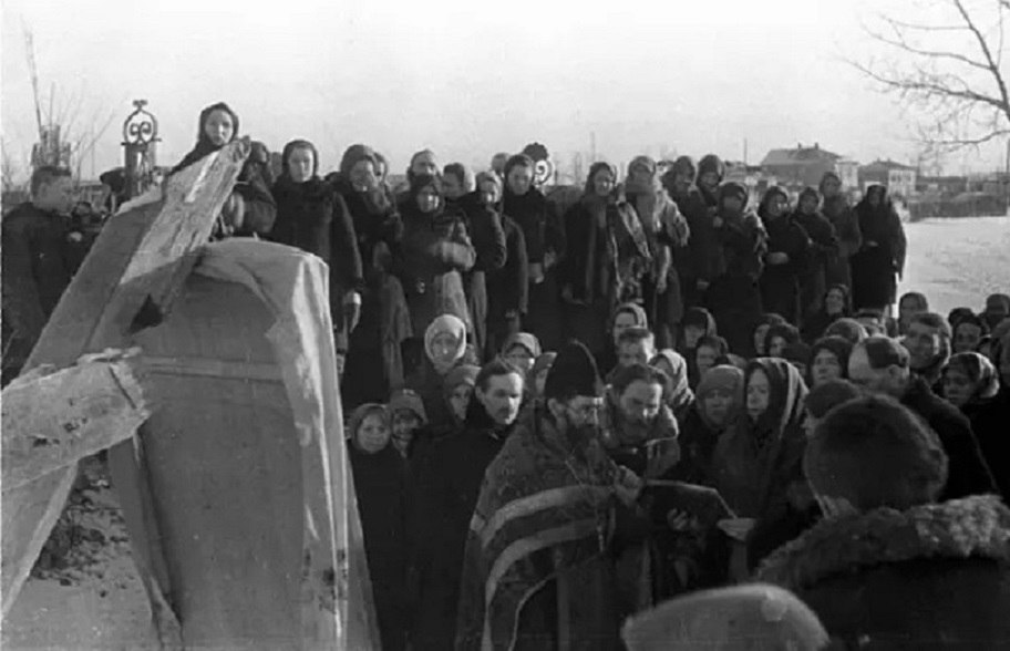 Молебен у руин церкви Казанской иконы Божией Матери в освобожденном от нацистов Гжатске (ныне Гагарин) Смоленской области. Март 1943 года.