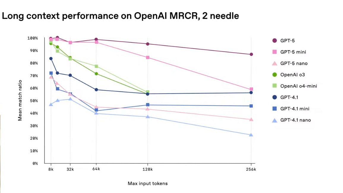 GPT-5 по тестам совсем иначе – до 64 тыс токенов точность близка к 100%, проседает до 96-97% на 128 тыс и выше 90% на 256 тыс. Вот это фундаментальный прорыв.