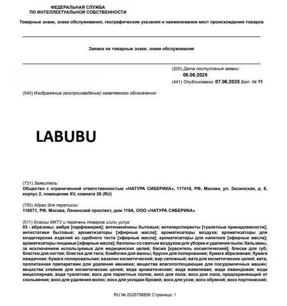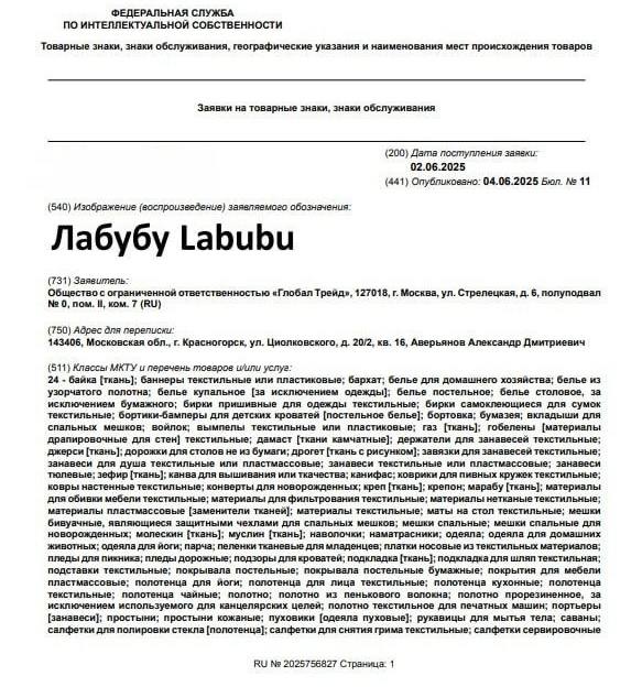 В РФ две компании хотят зарегистрировать товарный знак "Лабубу". Речь идет о "Глобал Трейд" и "Натура Сиберика".