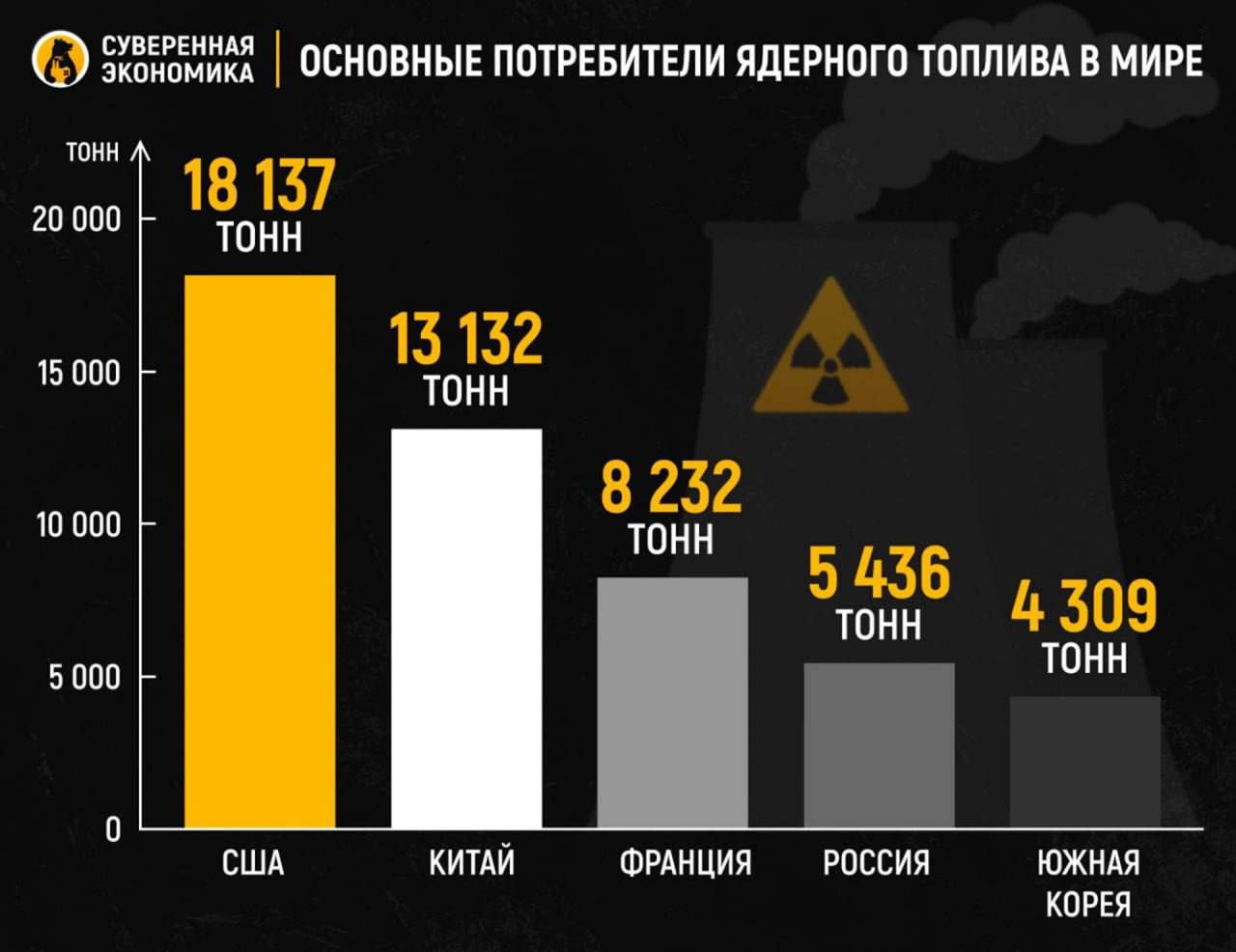 «Суверенная экономика» провела собственный анализ основных потребителей уранового топлива в мире. В список лидеров в 2024 году входят Китай, Франция, Россия и Южная Корея. По оценкам Всемирной ядерной ассоциации, в 2024 году Штатам потребуется 18 137 тонн. Почти четверть поставок обогащенного урана Вашингтон получает из России. При этом в год США самостоятельно производят около 75 тонн, преимущественно за счет переработки списанных ядерных боеголовок.