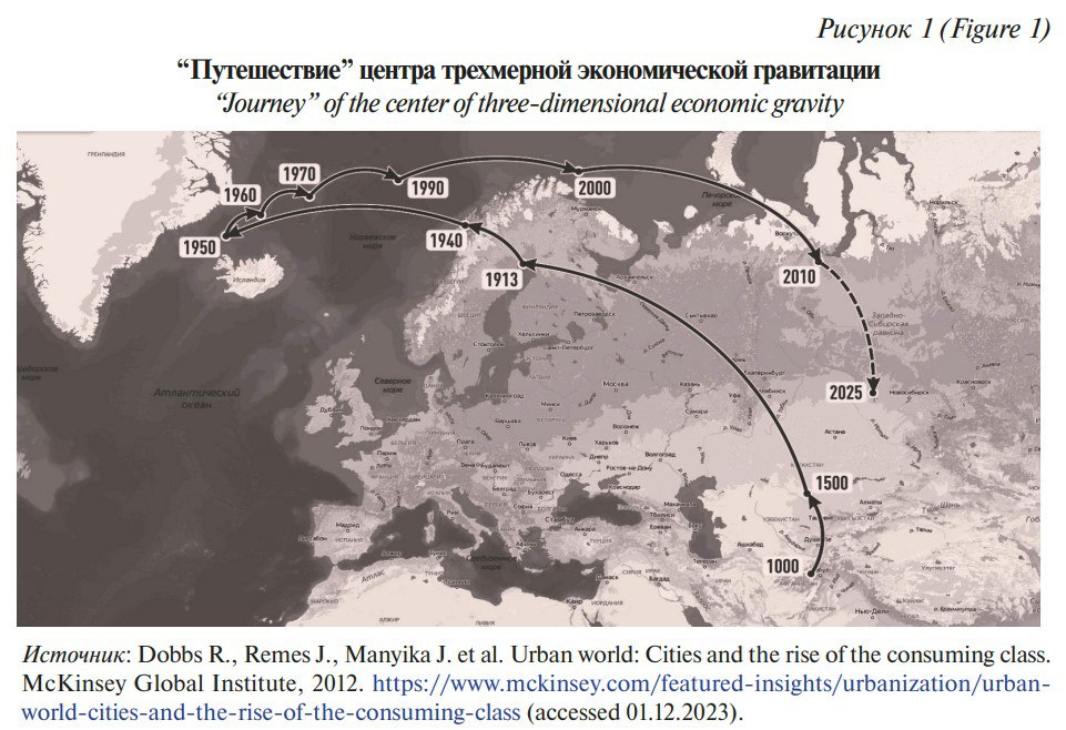 Представлена карта смещения планетарного центра экономической гравитации за тысячу с лишним лет. Оно, условно, началось в Ц.Азии, на территории Газневидского государства (современный Афганистан). Затем центр сместился на северо-запад, а разруха в послевоенной Европе резко (всего за 10 лет) вытолкнула его на Запад, в район Гренландии. Позже он развернулся на Восток. Самый резкий сдвиг, в 2000-2010 гг., со склонением на юго-восток связан с возвышением Китая. Центр экономической гравитации практически вернулся по меридиану, но остался севернее точки старта более чем на 2000 км, что говорит о возврате к тысячелетнему балансу экономической силы между Западом и Востоком».