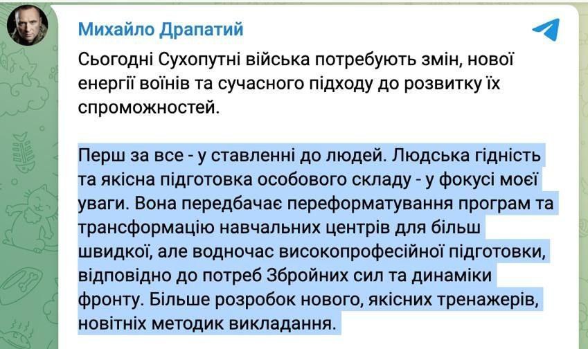 Об этом сообщил у себя в блоге новый главнокомандующий Сухопутных войск Украины (отвечающий за обучение пополнения) Миша Драпатый.
