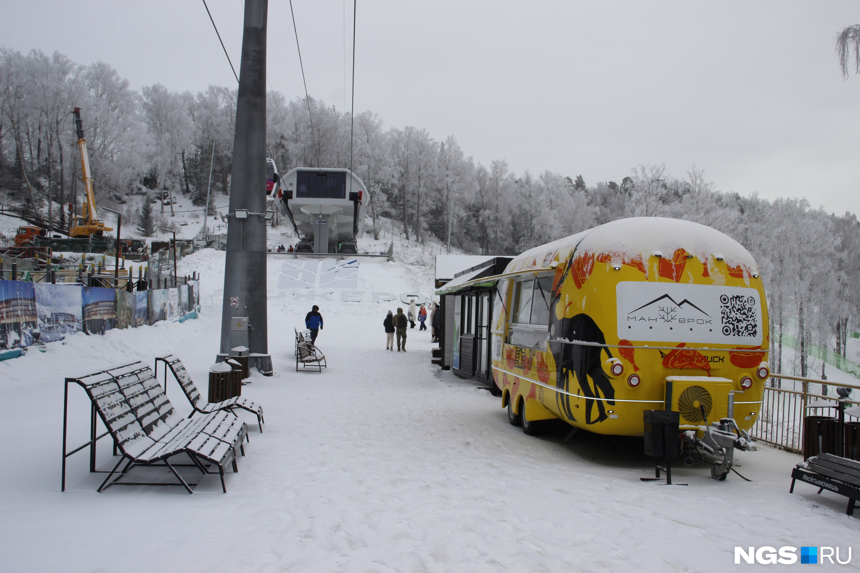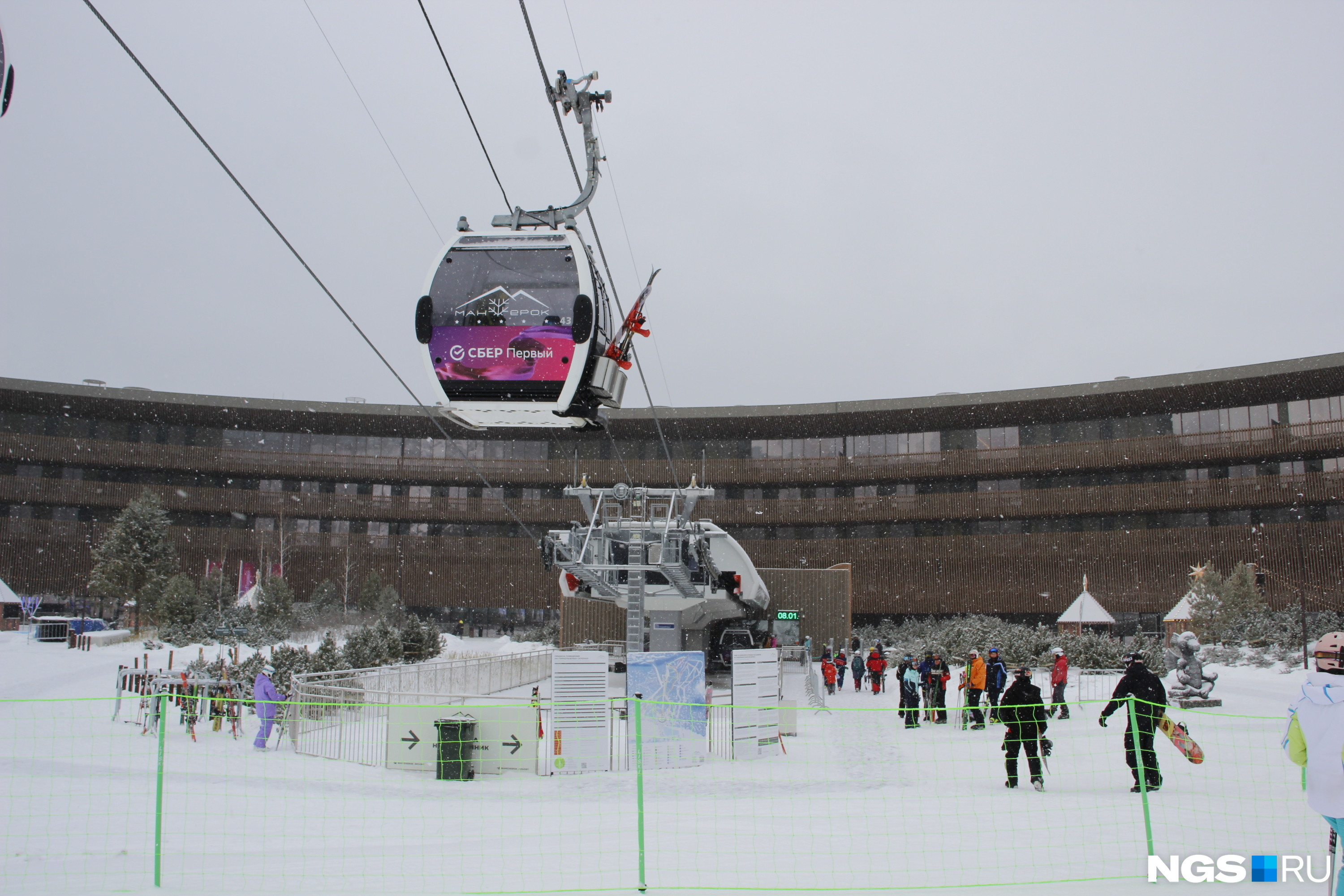 Сбер продвигает Манжерок как всесезонный курорт, но историческая его специализация — горнолыжная. Основной подъемник, который здесь настойчиво называют «канатной дорогой» (по ней действительно «ходят» закрытые гондолы на восемь человек), начинается сразу у выхода из пятизвездочного отеля. Он делает в пути одну остановку — для тех, кому достаточно наиболее простых трасс, — и везет всех желающих на высоту 1020 м. Там находится смотровая площадка и несколько вагончиков с едой и напитками.