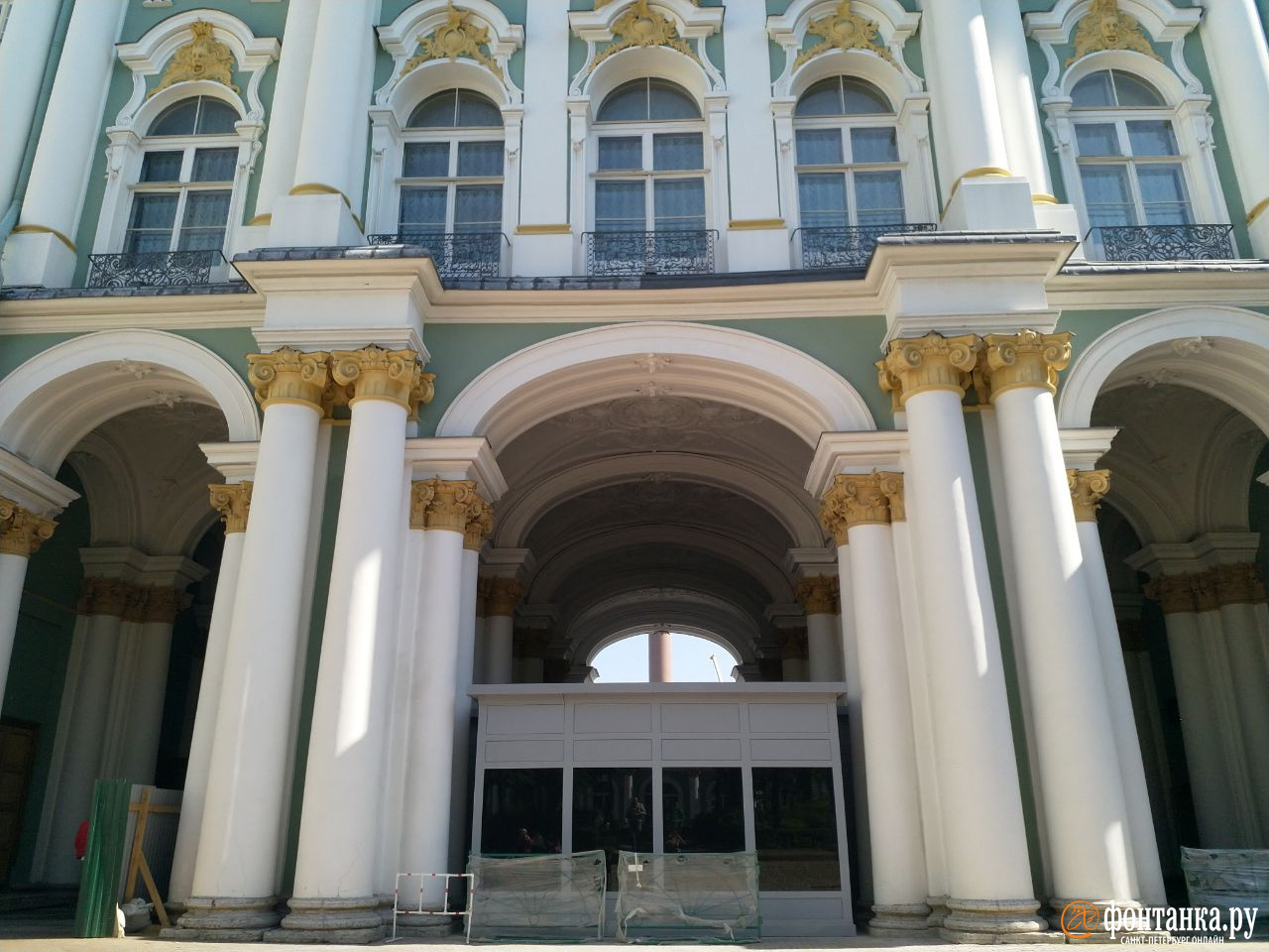 Досмотровый павильон Эрмитажа, об одобрении которого экспертизой стало известно всего три дня назад, материализовался уже к концу рабочей недели. Теперь проход в Большой двор Зимнего дворца осуществляется через правую из трех арок, ведущих с Дворцовой площади, остальные две закрыты ажурной решеткой ворот.