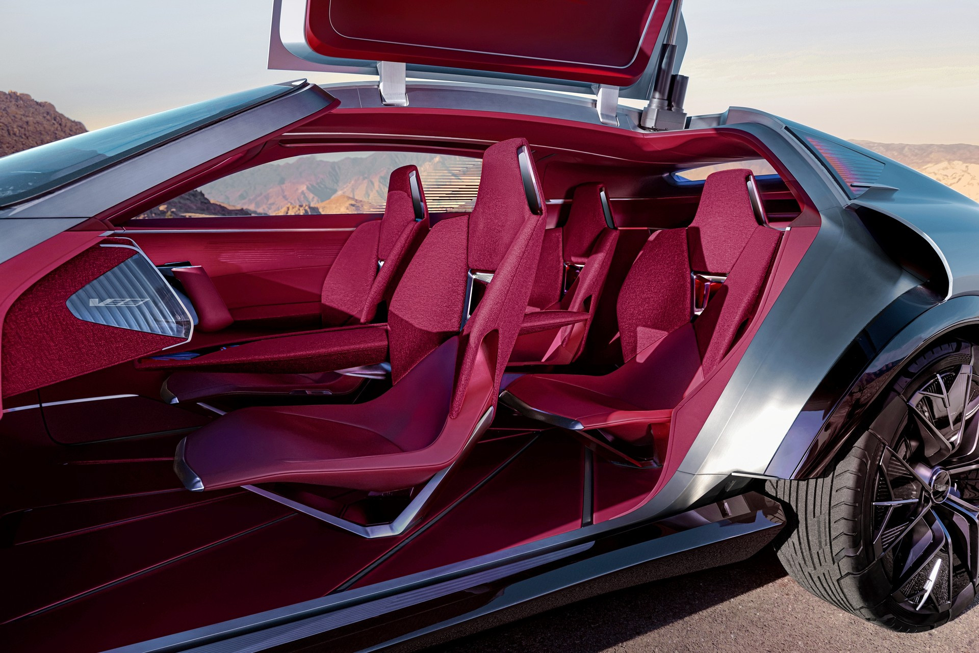 Сразу скажем, что пресс-служба Cadillac ничего толком не говорит о силовой установке Elevated Velocity — известно только, что она полностью электрическая и очень мощная, способная обеспечить разгонную динамику на уровне суперкара. Очень крупный на вид кузов (его размеры не указаны) типа фастбек покоится на гигантских 24-дюймовых колёсах, изготовленных из композитного материала на основе льняных волокон. Адаптивная пневмоподвеска регулирует величину дорожного просвета в зависимости от выбранного ездового режима. Широченные двери, напоминающие крылья чайки, дают доступ сразу к сиденьям первого и второго рядов, центральных стоек у кузова нет.