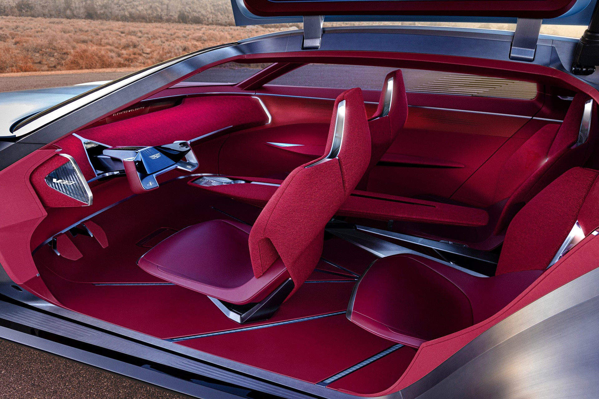 Посадочная формула салона Cadillac Elevated Velocity заявлена как 2+2, притом что задние места выглядят вполне полноценными. Основу отделки составляет гладкая кожа в сочетании шероховатой тканью букле. Предполагается, что кросс-купе сможет ездить в полностью беспилотном режиме, при активации которого салон можно превратить с мобильный спа-кабинет со светотерапией и дыхательным тренажёром, руль и педали при этом убираются, чтобы не мешать процедурам.