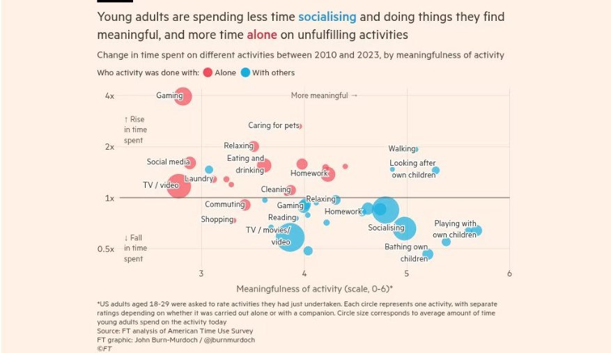 Время, проведённое за экраном, продолжает расти, и молодые люди в США проводят больше времени в одиночестве, чем когда-либо прежде. Как показывает приведенная диаграмма из FT, в 2023 году молодые люди тратили в 4 раза(!!!) больше времени на игры, на 75% больше времени на социальные сети и примерно на 25% меньше времени - на общение, чем молодые люди в 2010 году.