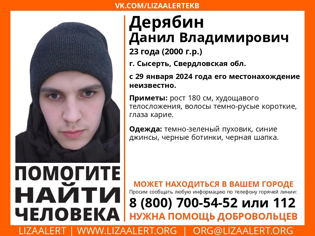 Волонтеры рассказали подробности о пропаже 23-летнего Данила Дерябина. Парень исчез 29 января в Сысерти, однако выяснилось, что 31-го числа он уже был в Екатеринбурге. Дальше его след теряется.