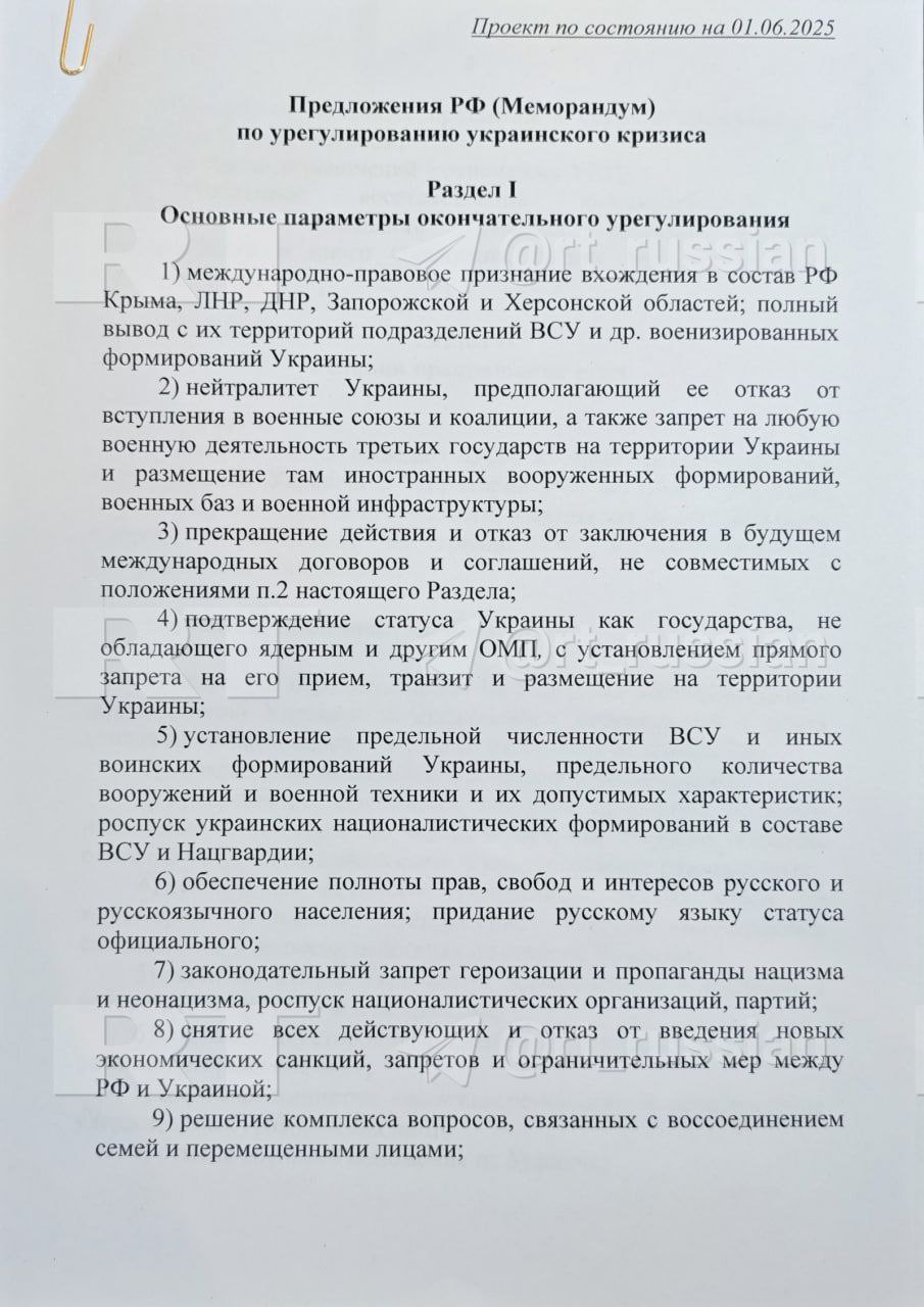 ⚡️RT публикует полный текст российского меморандума, переданного украинской стороне. 🟩 Подписаться | Прислать новость | Читать аналитику