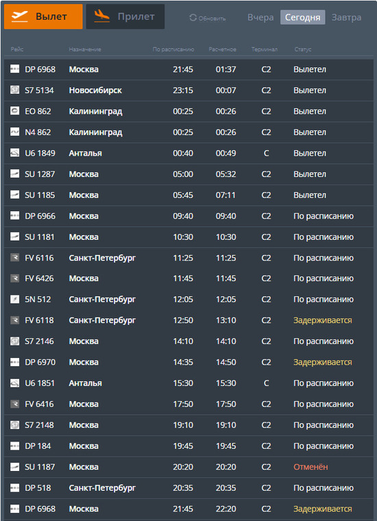 По данным на онлайн-табло воздушной гавани, перелеты в обратных направлениях также перенесли на 30–40 минут. Отменили рейс SU 1187 до Москвы.
