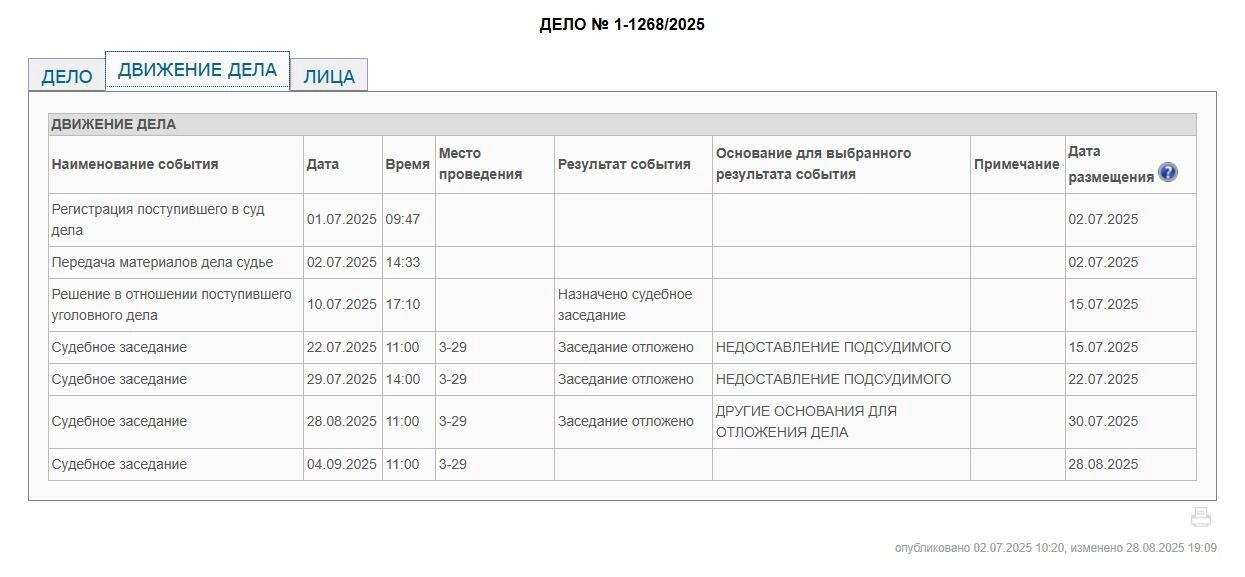 Дело поступило в суд в начале июля, заседания должны были пройти 22 и 29 июля, однако их отложили из-за «недоставления подсудимого».
