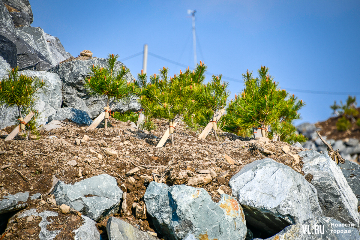 Этой весной на берегу Патрокла очень много заметных изменений. Большой стихийной парковки больше нет, на пустырь завезли грунт, подняв его уровень над морем. Ближе к полуострову Басаргина уже поработали ландшафтные дизайнеры: впервые на Патрокле появились земляные валы, оформленные каменными валунами. На этих искусственных холмах уже в большом количестве высадили саженцы сосны густоцветковой. В перспективе, на берегу может вырасти лес. А пока новый рельеф станет защитой от ветров.