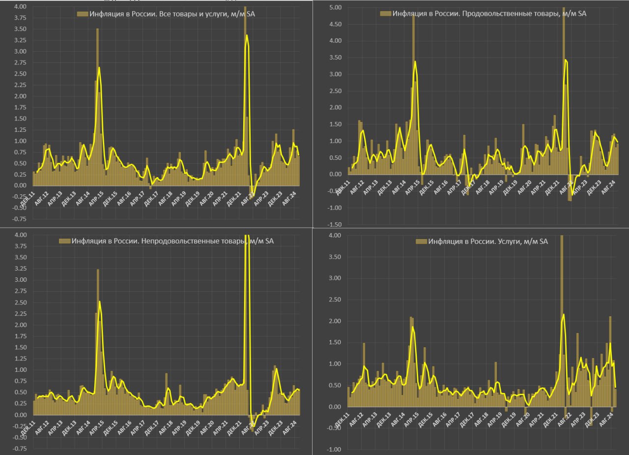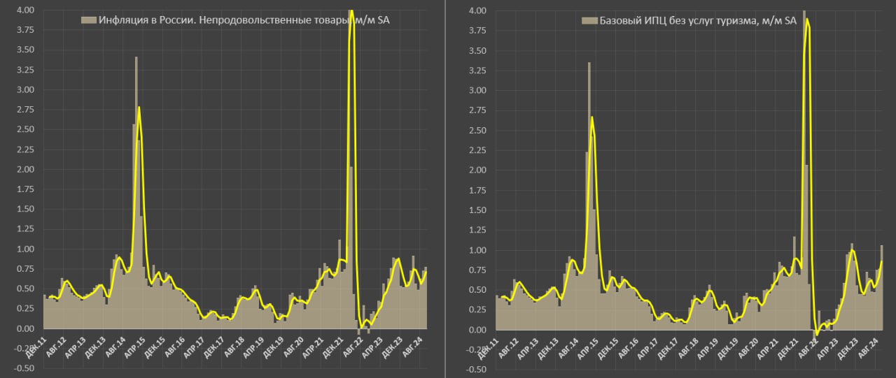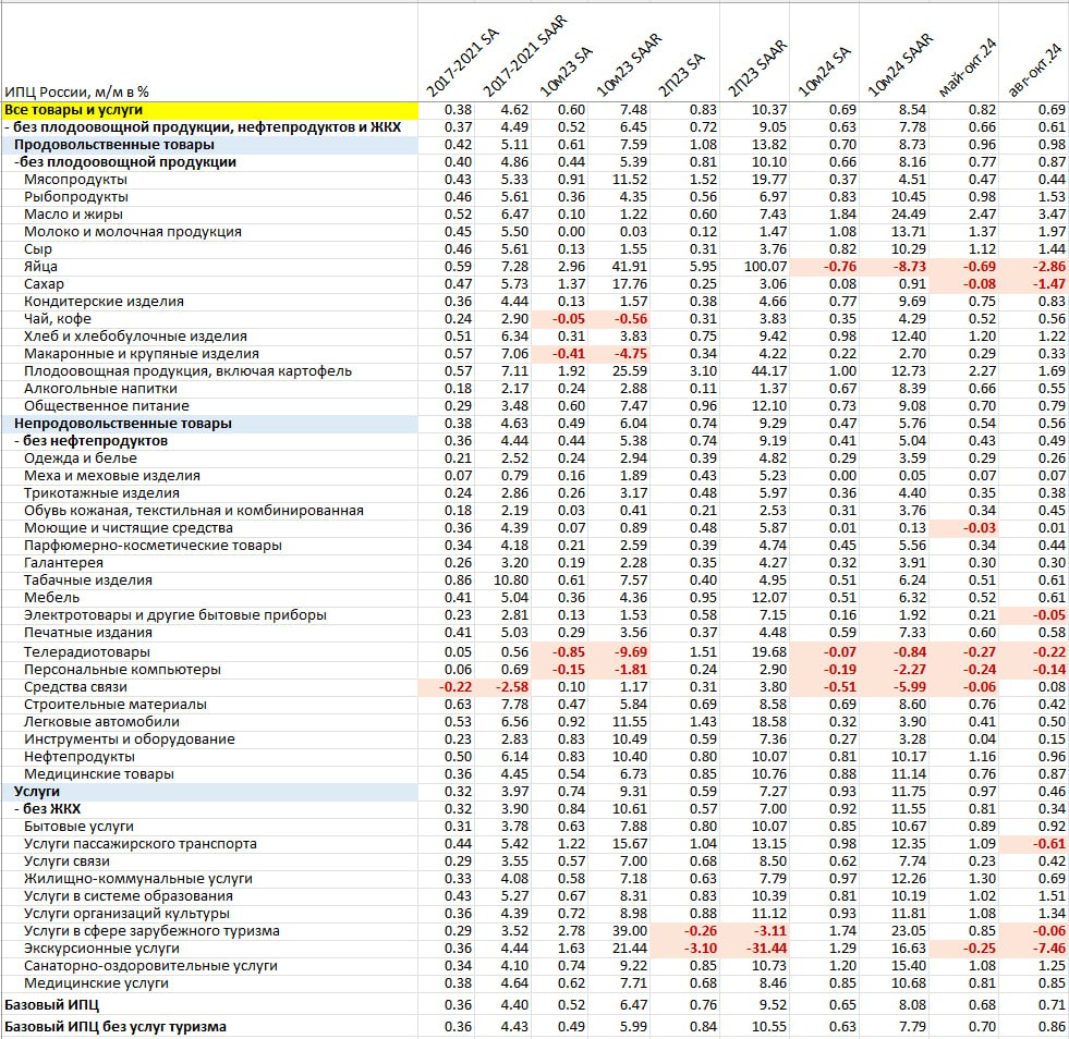 ● Непродовольственные товары – 0.58% м/м в октябре, за 3м – 0.56%, за 6м – 0.54%, за 10м24 – 0.47% vs 0.49% за 10м23 и нормы около 0.38%. Отклонение от нормы почти в 1.5 раза за три месяца.