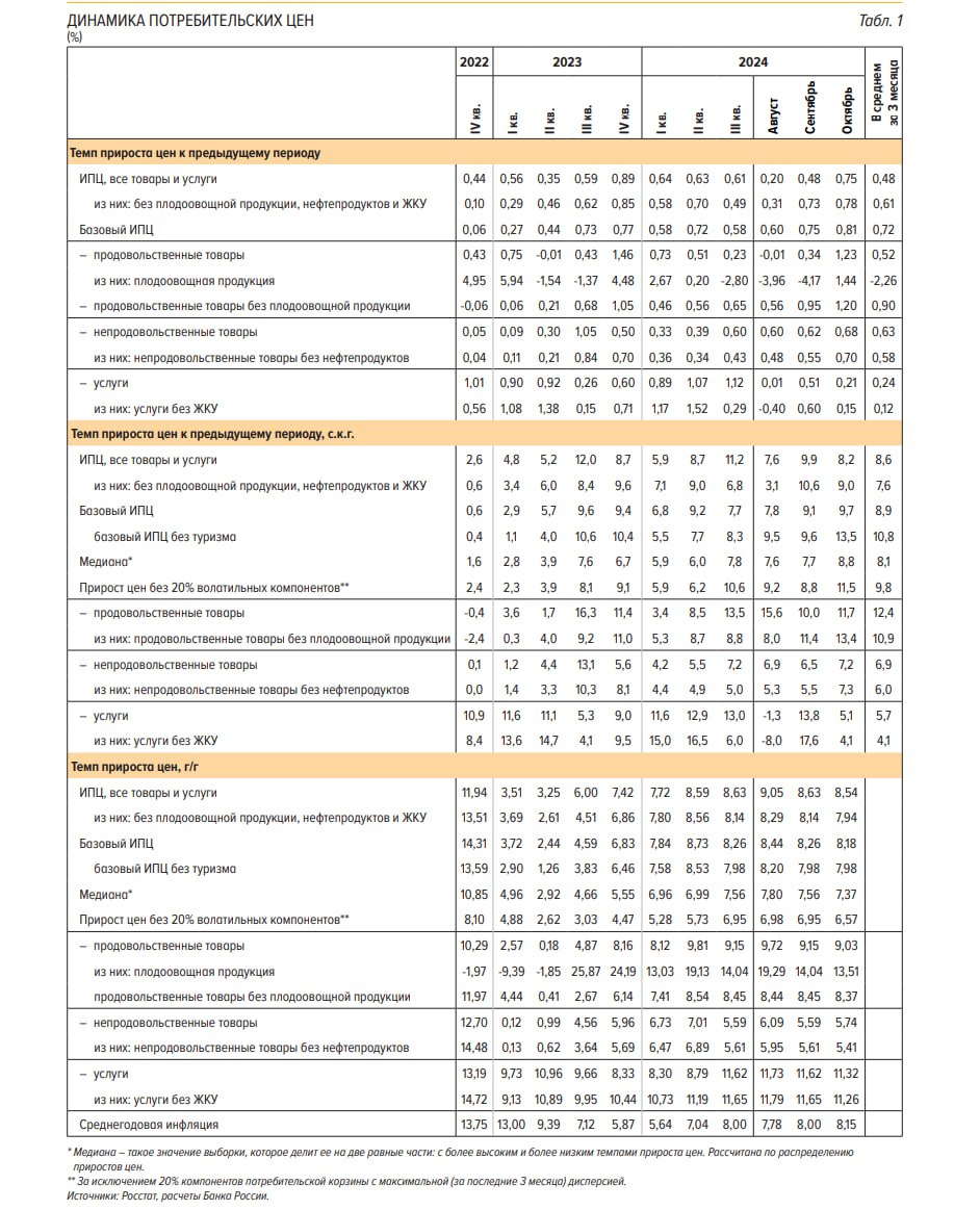 ● Базовый ИПЦ без учета туризма (так называемые устойчивые компоненты инфляции) вырос на 1.06% в октябре, за 3м – 0.86%, за 6м – 0.7%, за 10м24 – 0.63% vs 0.49% за 10м23 и среднесрочной нормы 0.36% за 5 лет. Отклонение от нормы в 2.4 раза.