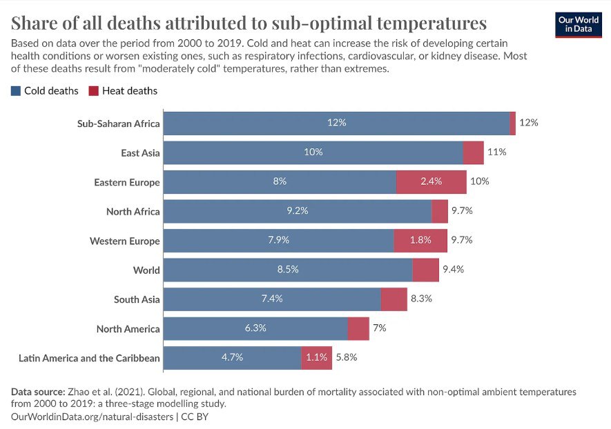 Во всём мире число смертей от холода превышает число смертей от жары, а не только в странах с холодным климатом. Просто для каждого региона своё понятие «холода» - например, в столице Индии Дели это может быть ночная температура +2-5 градусов. Т.е. это отклонение от средней климатической нормы в сторону похолодания.