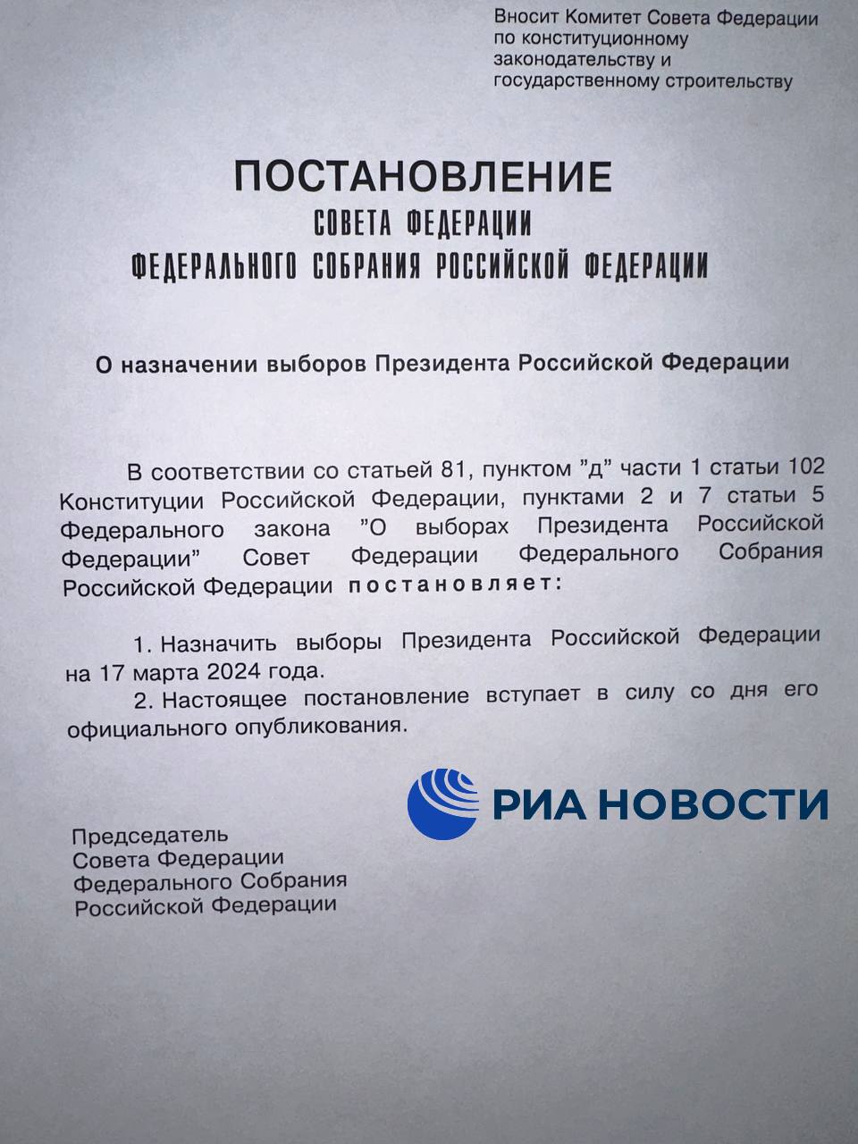 Совет Федерации на заседании 7 декабря обсудит вопрос о назначении выборов президента Российской Федерации на 17 марта 2024 года, проект постановления включен в повестку заседания