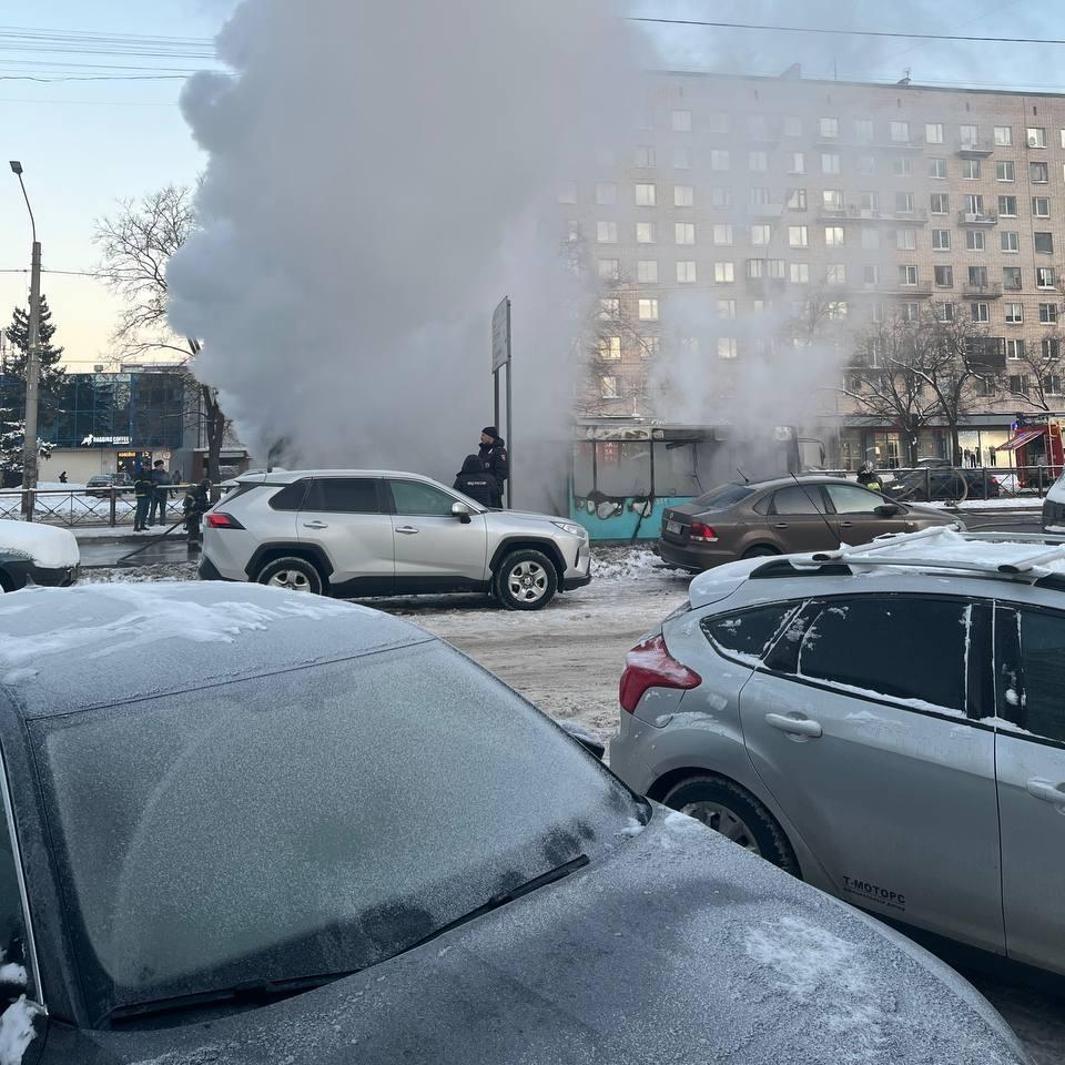 Лазурный автобус полностью выгорел во время утреннего пожара в Кировском районе Петербурга 18 декабря. На месте сохраняется крупная пробка.