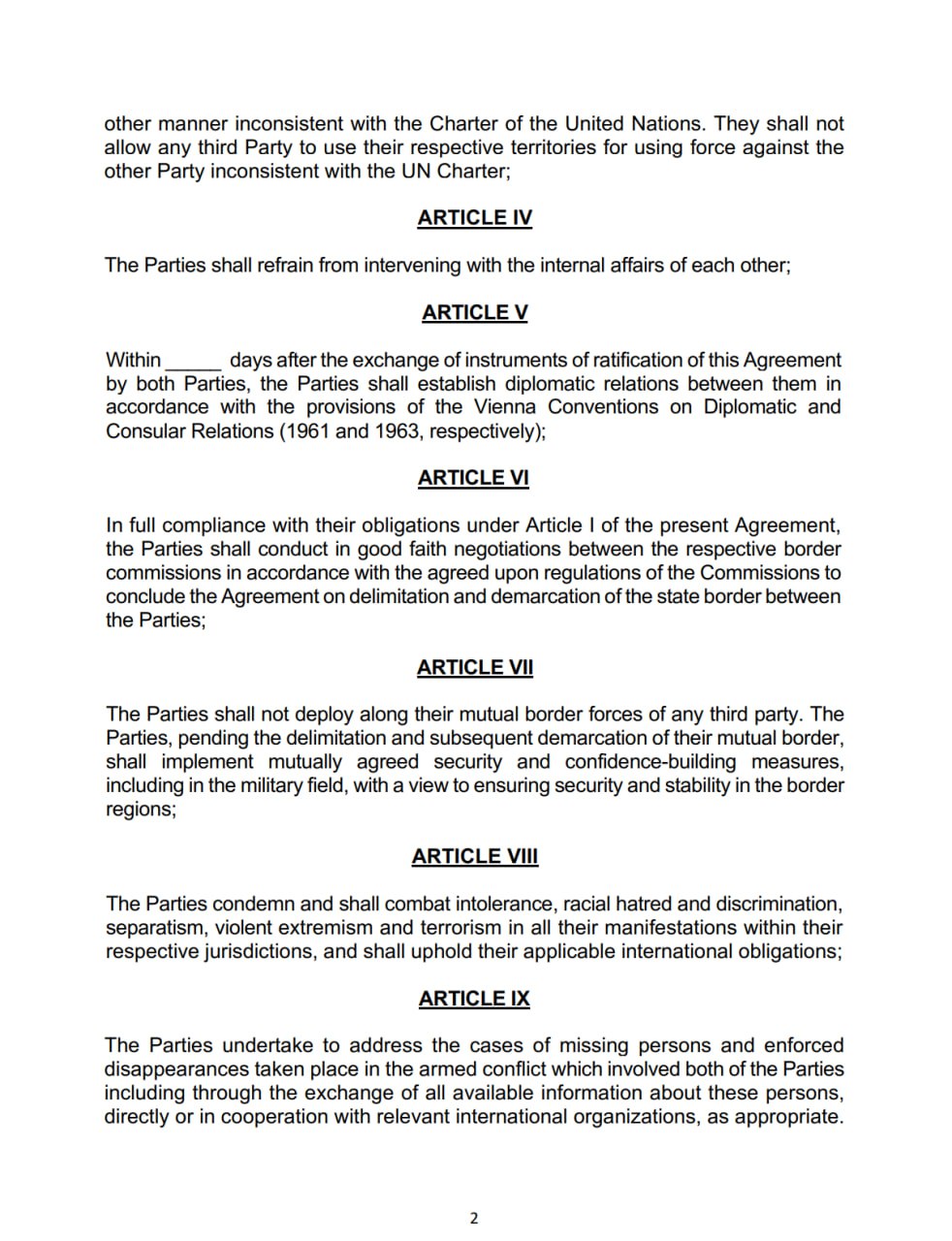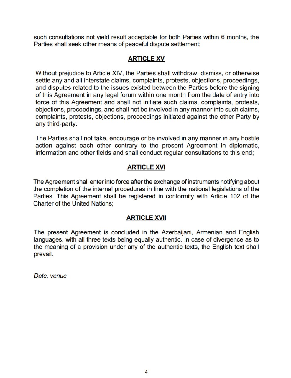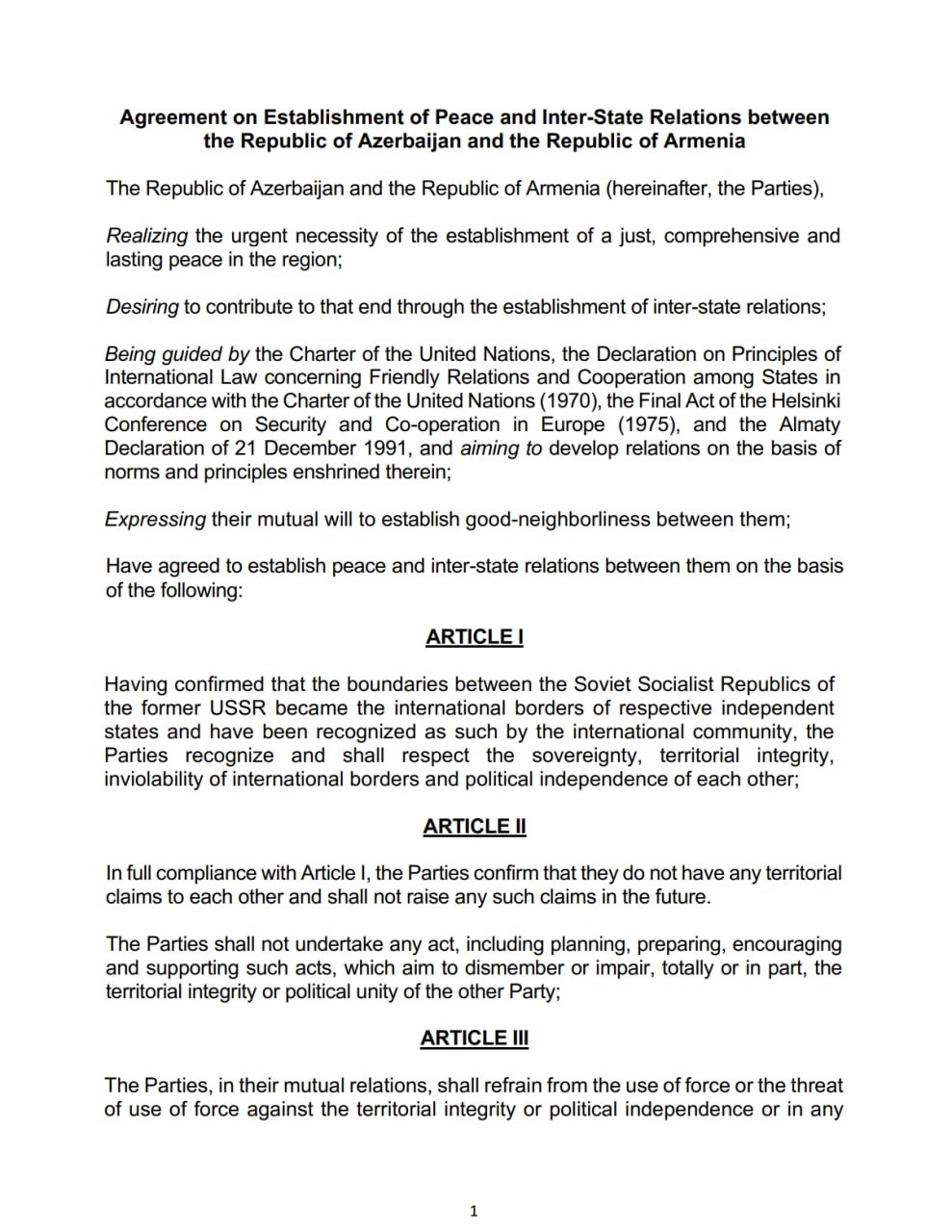 МИД Азербайджана опубликовал текст мирного соглашения между Ереваном и Баку. По нему стороны не имеют территориальных претензий друг к другу.
