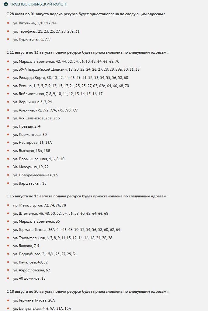 В Краснооктябрьском районе ограничения будут вводить с 13 по 15 августа и с 18 по 20 августа. Воды не будет по улицам Штеменко, Еременко, Титова, Триумфальная, Бажова, Поддубного и не только.