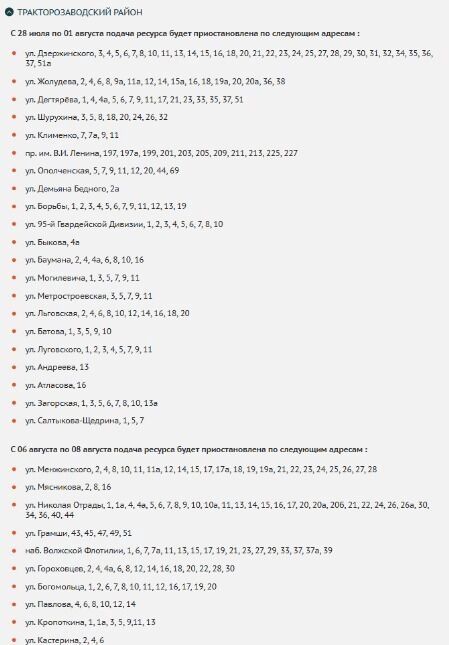 В Тракторозаводском районе ограничение введут с 6 по 8 августа. Не повезет домам по улицам Мясникова, Отрады, Гороховцев, Богомольца, Павлова и другим.