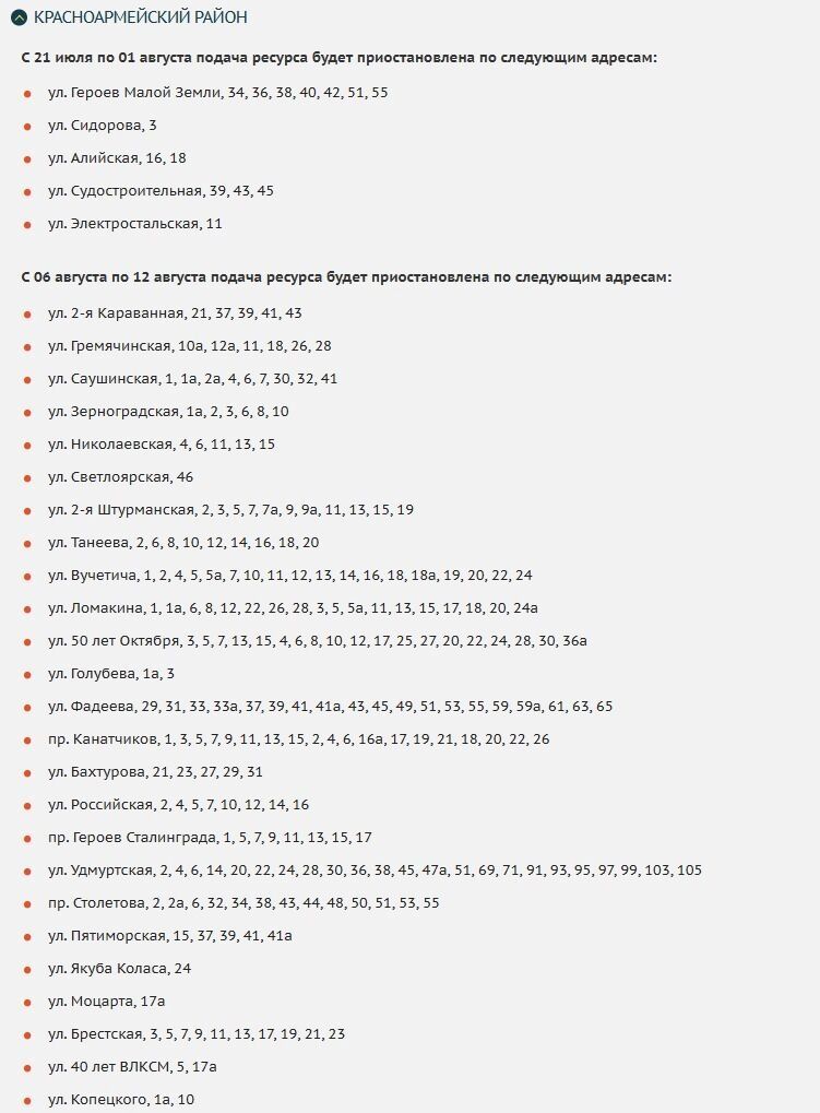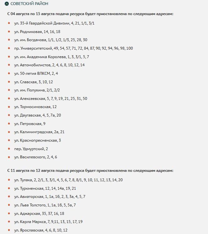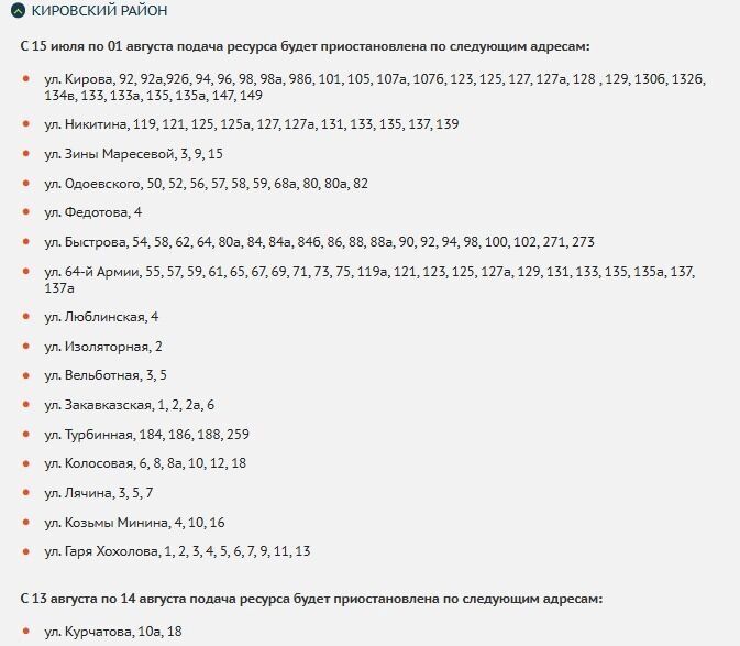 В Советском районе воды не будет с 4 по 15 августа и с 11 по 12 августа. В списке ограничений такие улицы, как 35-й Гвардейской Дивизии, Родниковая, Королева, Алексеевская, Даугавская, Краснопресненская и не только.