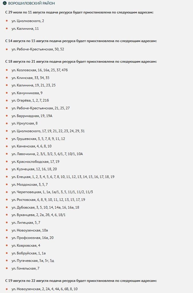 В Ворошиловском районе ожидается четыре волны ограничений: с 29 июля по 11 августа, с 14 по 15 августа, с 18 по 21 августа и с 19 по 22 августа. Потерпеть придется жителям улиц Циолковского, Калинина, Рабоче-Крестьянская, Козловская, Клинская, Огарёва, Баррикадная и т. д.