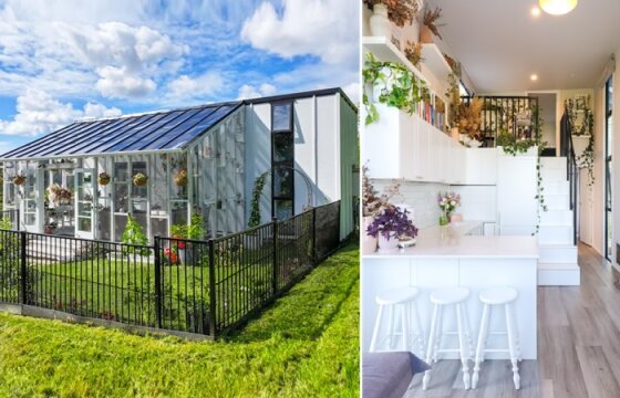 Примечательно: При размерах основного дома 10 х 3 метра (длина и ширина соответственно) пристройка с многофункциональной оранжереей имеет чуть меньшую площадь. Она, как и жилище, установлена на деревянной платформе, закрепленной на винтовых сваях, которые немного приподнимают их над землей. Из-за небольшого склона их высота имеет разное значение, что позволило без дополнительных затрат выровнять площадку. Поскольку Кэтрин мечтала о собственном зимнем саде, три стены и потолок сделали полностью стеклянными.