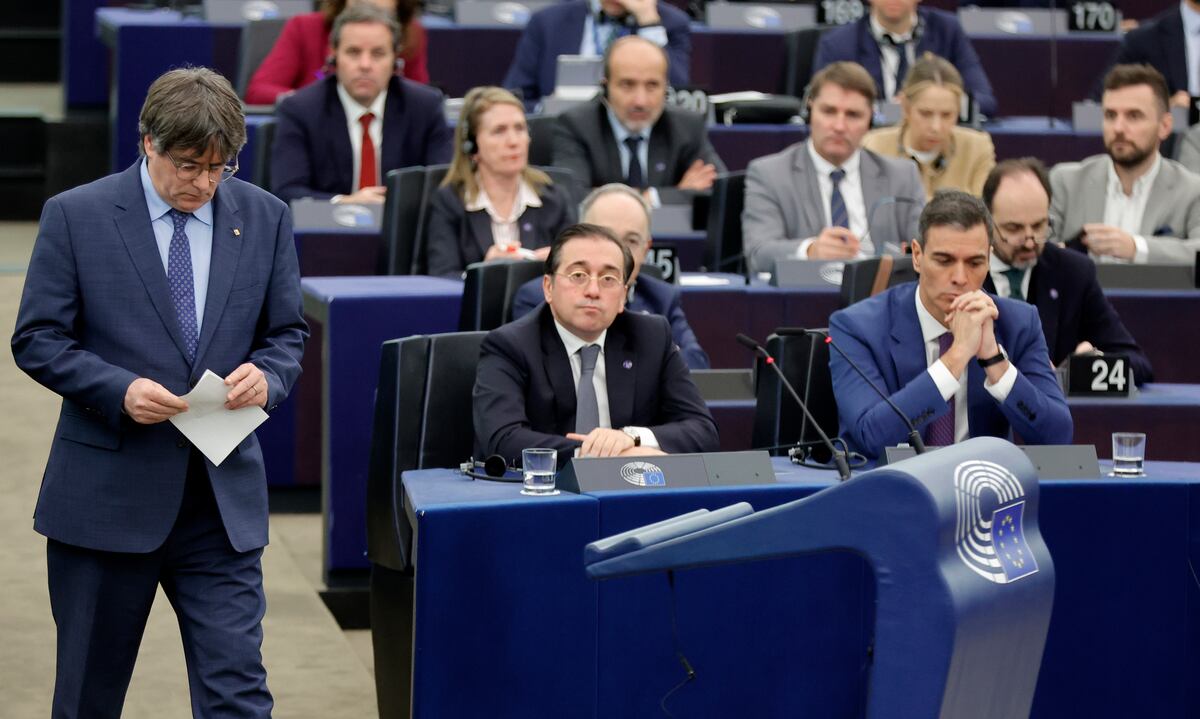 Y es ahí donde Sánchez, por primera vez desde el procés, estableció un breve diálogo en público con Carles Puigdemont. Los dos dirigentes, que acaban de pactar una investidura a través de intermediarios, llevan sin hablar desde 2017, al menos que se sepa. Sánchez ya ha roto ese tabú con Oriol Junqueras, líder de ERC, con el que llevaba años sin hablar y al que llamó hace un mes. Con Puigdemont aún no se ha roto esa barrera y pese a que estaban en la misma ciudad durante dos días y en el mismo hemiciclo varias horas, La Moncloa y Junts no organizaron una reunión, al menos así lo aseguran fuentes de los dos lados. Tampoco se organizó finalmente un saludo. Ambos estuvieron a menos de dos metros, separados solo por el ministro de Exteriores, José Manuel Albares, porque Puigdemont pasó al lado de ellos para encaminarse al atril. Pero el expresident no quiso acercarse a saludar a Sánchez, pese a tenerlo a pocos metros, al contrario de lo que hicieron otros eurodiputados, incluido uno de ERC. Se evitó así la foto esperada, pero no fue Sánchez quien la impidió, sino Puigdemont, que era el que estaba de pie y tenía muy fácil acercarse al presidente a darle la mano como hizo Junqueras en 2019 en el Congreso, cuando salió de la cárcel para el primer pleno de la legislatura y después perdió el acta. Sánchez y Puigdemont decidieron así no saludarse, pero el formato del diálogo fue otro: el presidente se dirigió al líder de Junts con reconocimiento político y le animó a avanzar en la senda del reencuentro: “señor Puigdemont, está en nuestras manos lograrlo [el objetivo de recuperar el diálogo], creo que la ley de amnistía es un buen paso en esta dirección. Es constitucional y solo persigue superar el conflicto. Vamos a seguir promoviendo el uso de las lenguas cooficiales”, le prometió el presidente, en una respuesta a lo que había dicho el líder de Junts en el estrado, cuando se quejó de que él aún no podía hablar en catalán en el Parlamento Europeo pese a ser una lengua que hablan millones de europeos.