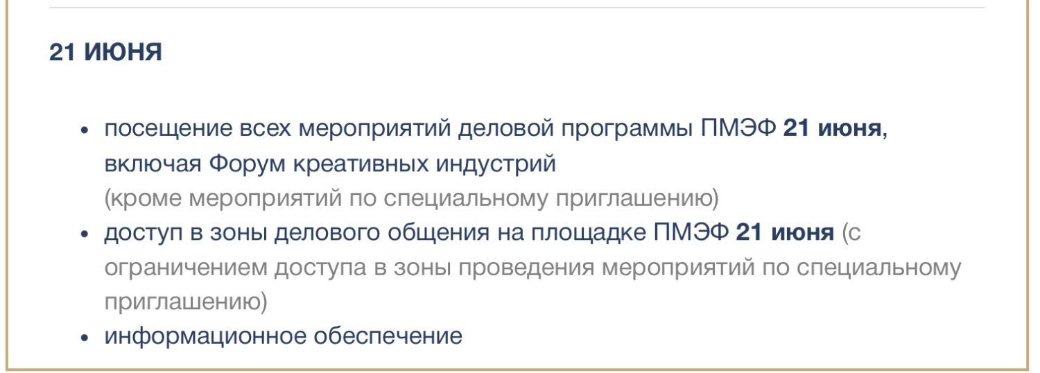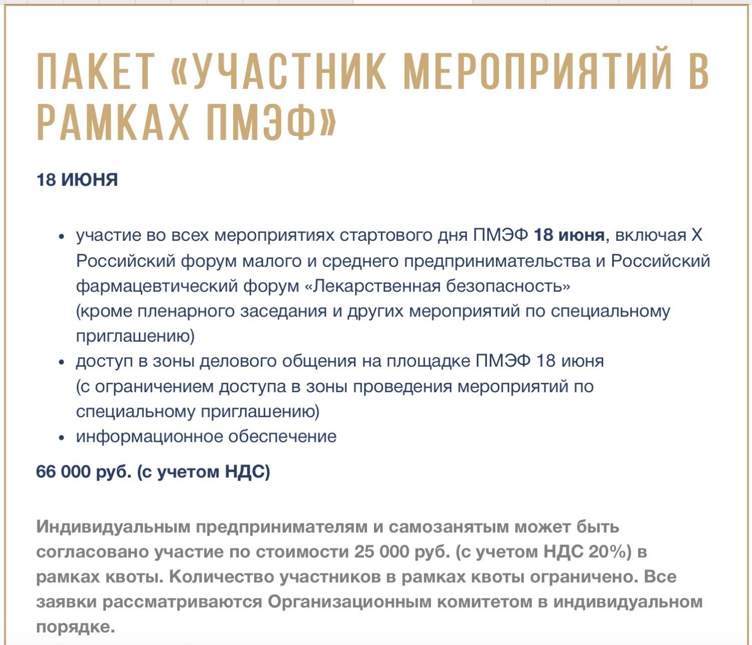 Если судить по сайту форума, то участие во всех мероприятиях деловой и культурной программы с 18–21 июня стоит почти 1,5 млн рублей. За пакет «участник мероприятий» придется отдать 66 тысяч рублей.