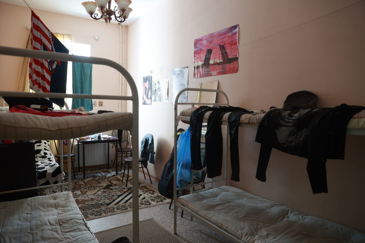 Убранство скромное: у окна в комнате на троих — стол с четырьмя стульями, три кровати, три тумбочки, два платяных шкафа. Койко-место в двухместном номере обойдется от 7,9 тысячи рублей в месяц, в шестиместном — от 5,5 тысячи.