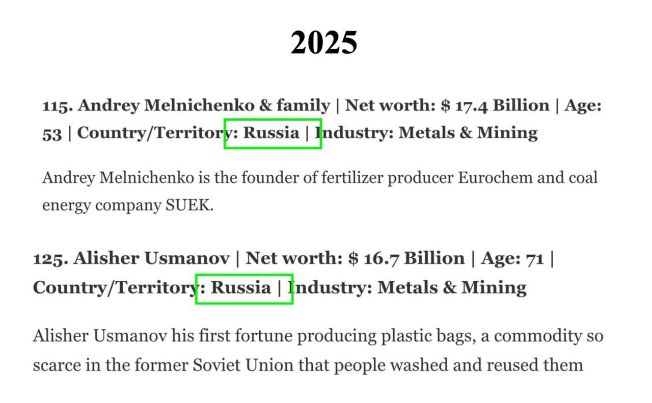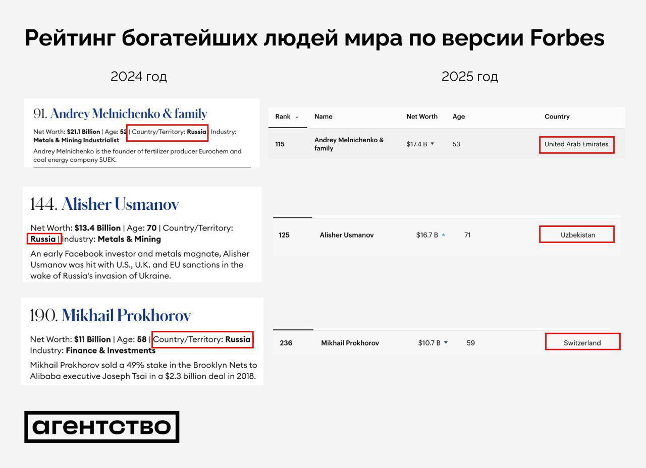 Много пишут, что американский Forbes в свежем рейтинге поменял страну у нескольких россиян – Андрею Мельниченко (на ОАЭ), Алишеру Усманову (на Узбекистан) и Михаилу Прохорову (на Швейцарию), и что похожая ситуация еще у 20 с лишним российских миллиардеров.