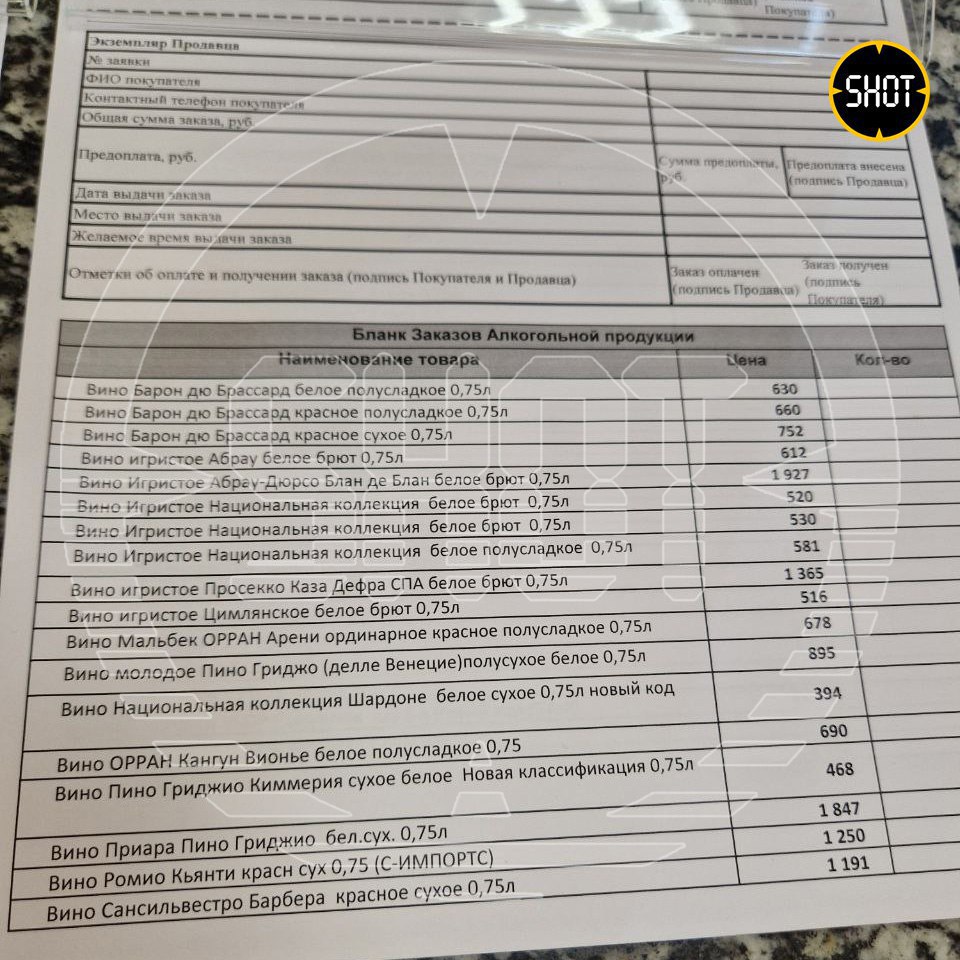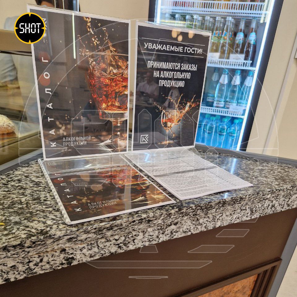 Приобрести алкоголь можно только с собой и только под заказ. В меню самые разные напитки: от водки до вина, в том числе из недружественных стран. Например, итальянское Priara Pinot Grigio и французское Baron du Brassard.