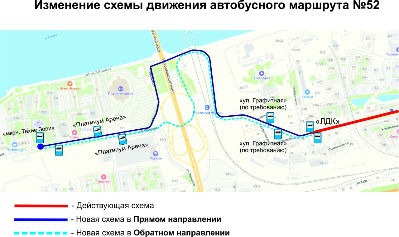 Автобус № 52 теперь будет иметь конечную не на ЛДК, а в «Тихих зорях». Также он будет останавливаться на «Платинум арене» и «Графитной».