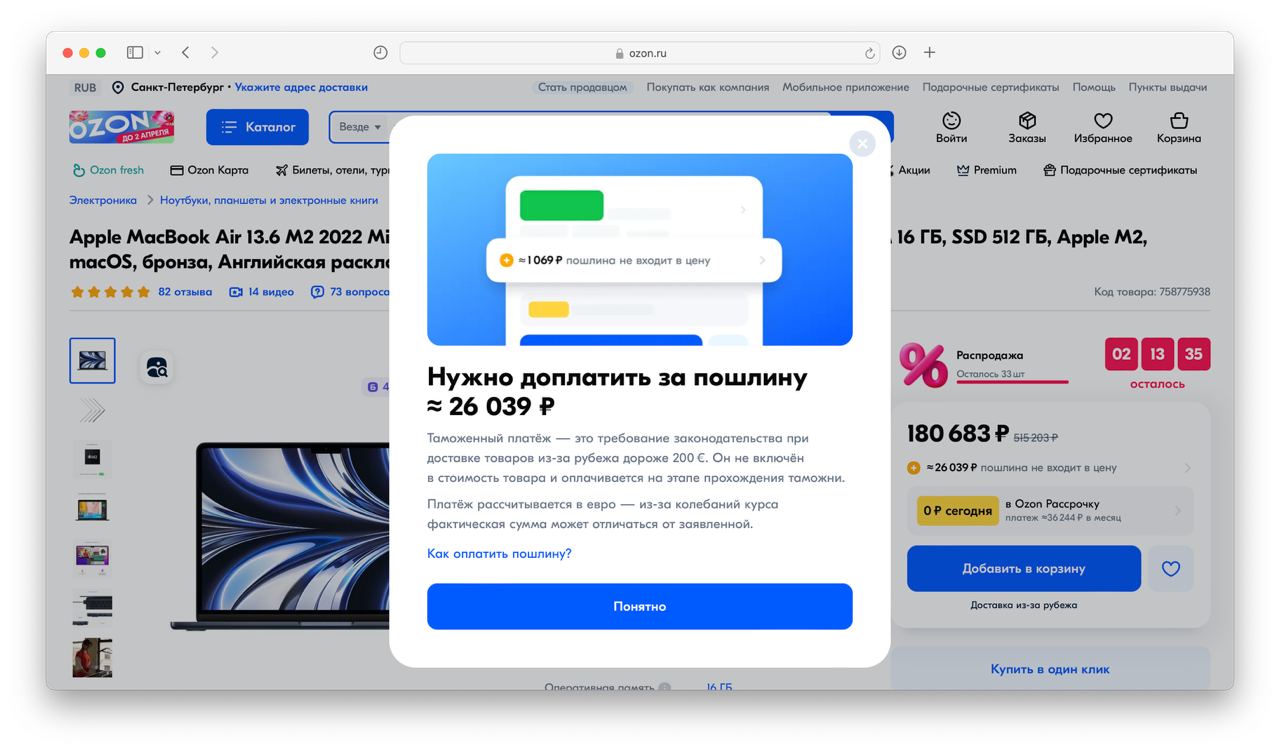 Размер пошлины зависит от стоимости товара. За новый OPPO или iPhone 15 нужно доплатить ₽11 тыс. К цене MacBook Air добавляют уже от ₽26 тыс.