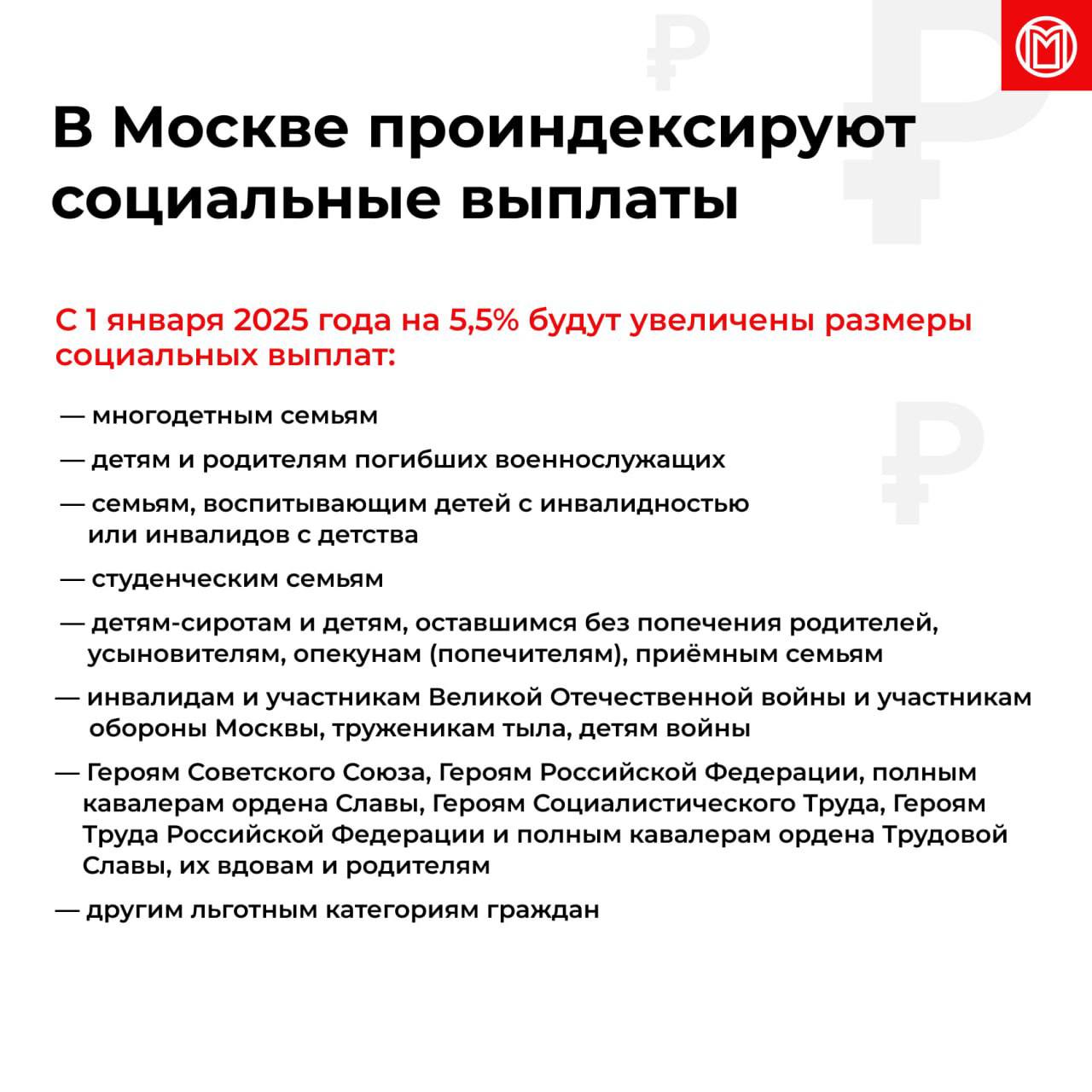 ❗️Москвичам с 1 января 2025 года на 5,5% проиндексируют социальные выплаты