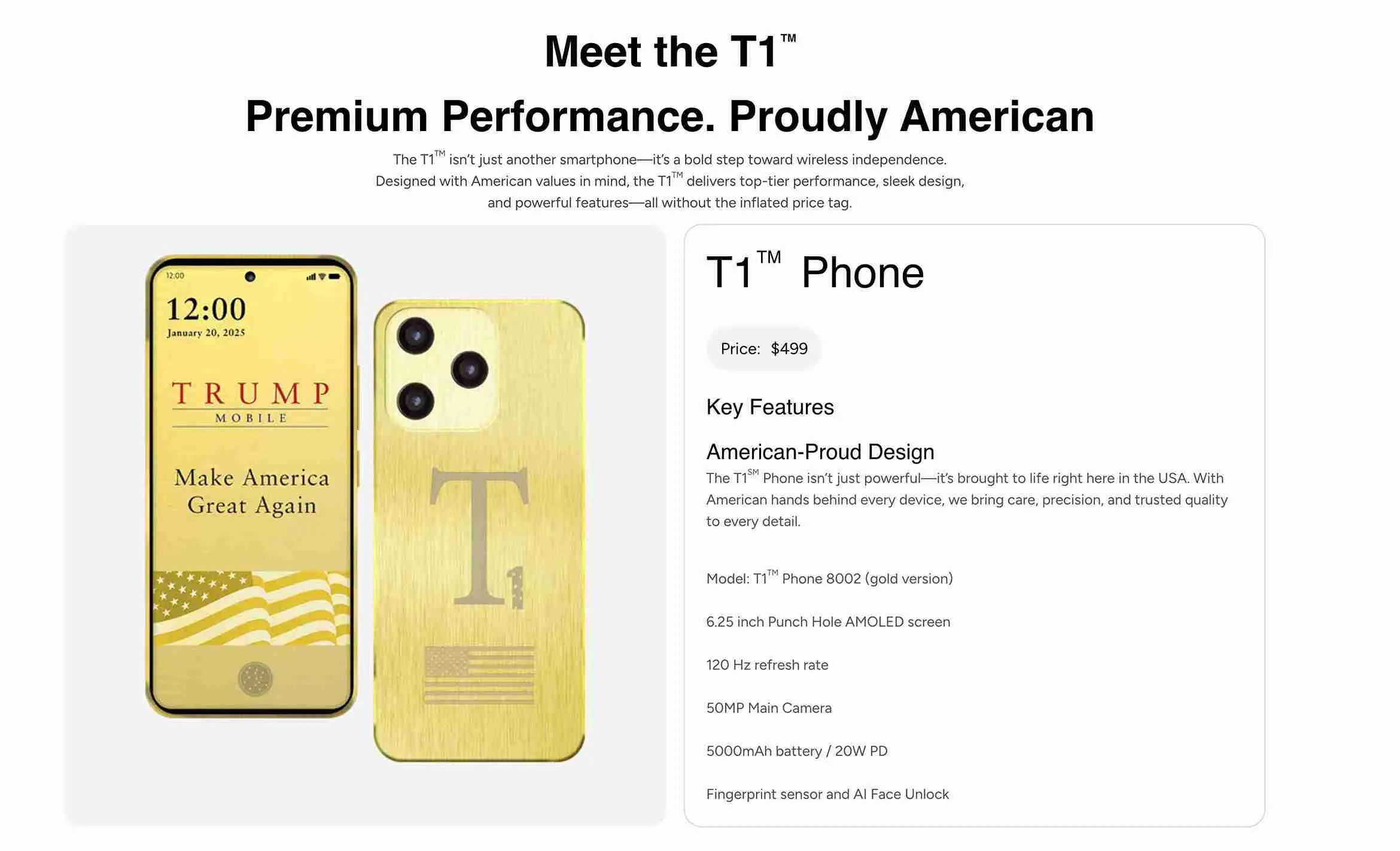 Анонс T1, представленного как золотой смартфон за $499, состоялся 16 июня вместе с запуском мобильного оператора Trump Mobile. Изначальные заявления о производстве в США вызвали скептицизм экспертов, так как сборка смартфонов в Америке требует сложной инфраструктуры, которой нет даже у крупных производителей, таких как Apple.