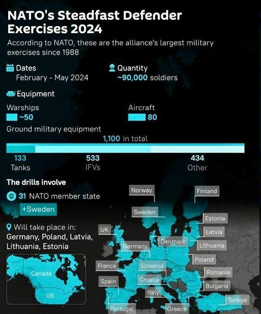 Помощник начштаба войск НАТО Гуннар Брюгнер заявил, что учения «Стойкий защитник 2024» не являются подготовкой к «войне с кем-либо». Конечно же ему все поверили. А расширение НАТО на Восток с перспективой всасывания в него Украины, Молдавии и Грузии, совершенно никак не угрожало России.