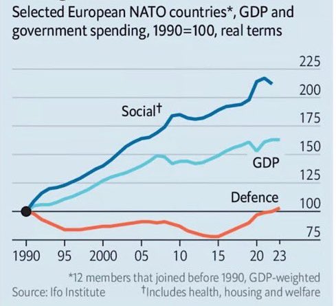 В частности, низкие расходы на оборону позволяли западноевропейским членам ЕС (12 стран НАТО на момент 1990 года) огромными темпами наращивать социалку.