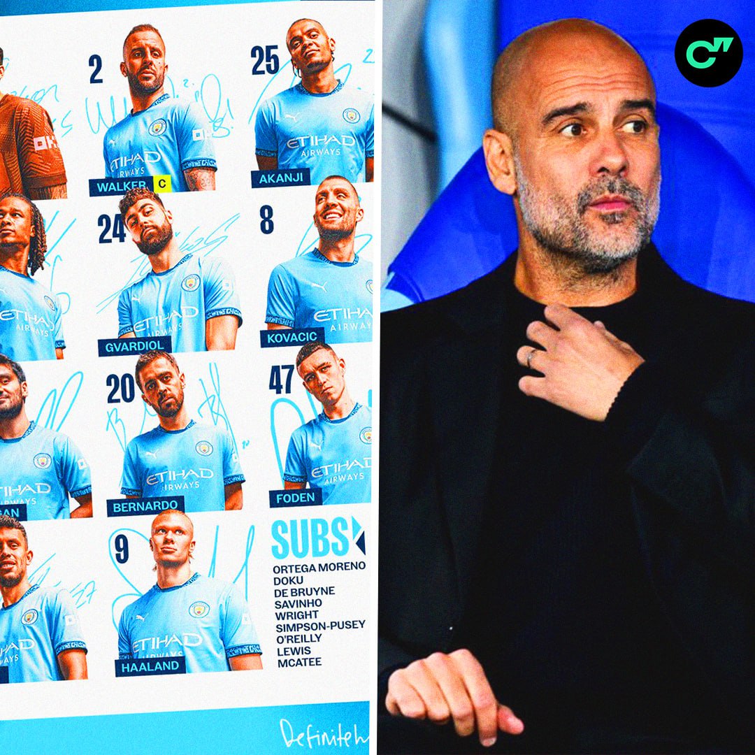 Состав «Ман Сити»: Гвардиол, Аканджи и Уокер в старте. Де Брюйне, Доку и Савио на скамейке запасных