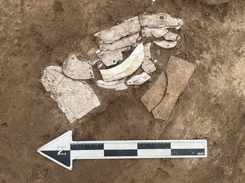 Найденный в юго-западном углу дома дракон размером около двадцати сантиметров состоит из нескольких раковин, плавно соединенных вместе и образующих всё тело от головы до хвоста. Дракон был извлечен в блоке почвы, чтобы опытные реставраторы могли расчистить его в лабораторных условиях.