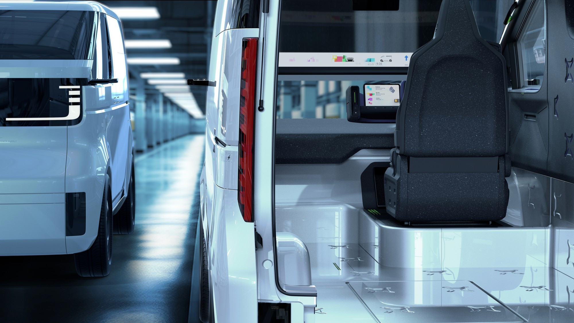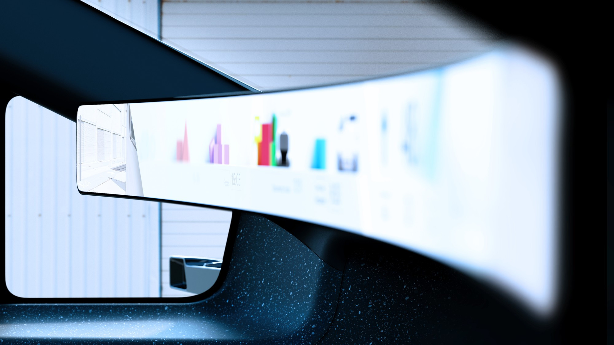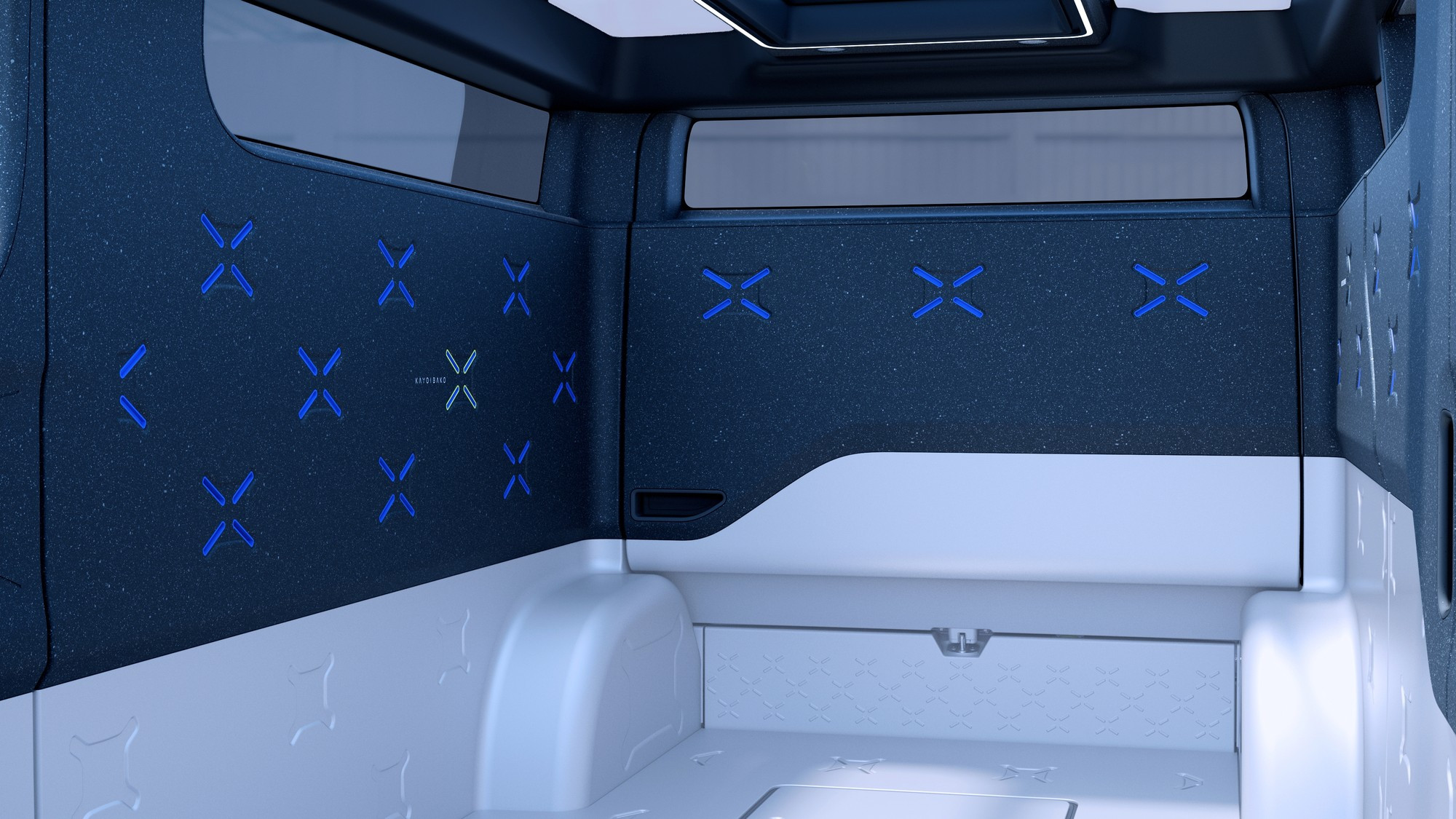 Место водителя оформлено предельно лаконично, вся оперативная информация выводится на панорамный щиток приборов во всю ширину салона (его крайние секции транслируют картинку с наружных камер заднего обзора), сбоку от руля-штурвала имеется ещё один сенсорный экран для настроек микроклимата и маршрута поездки.