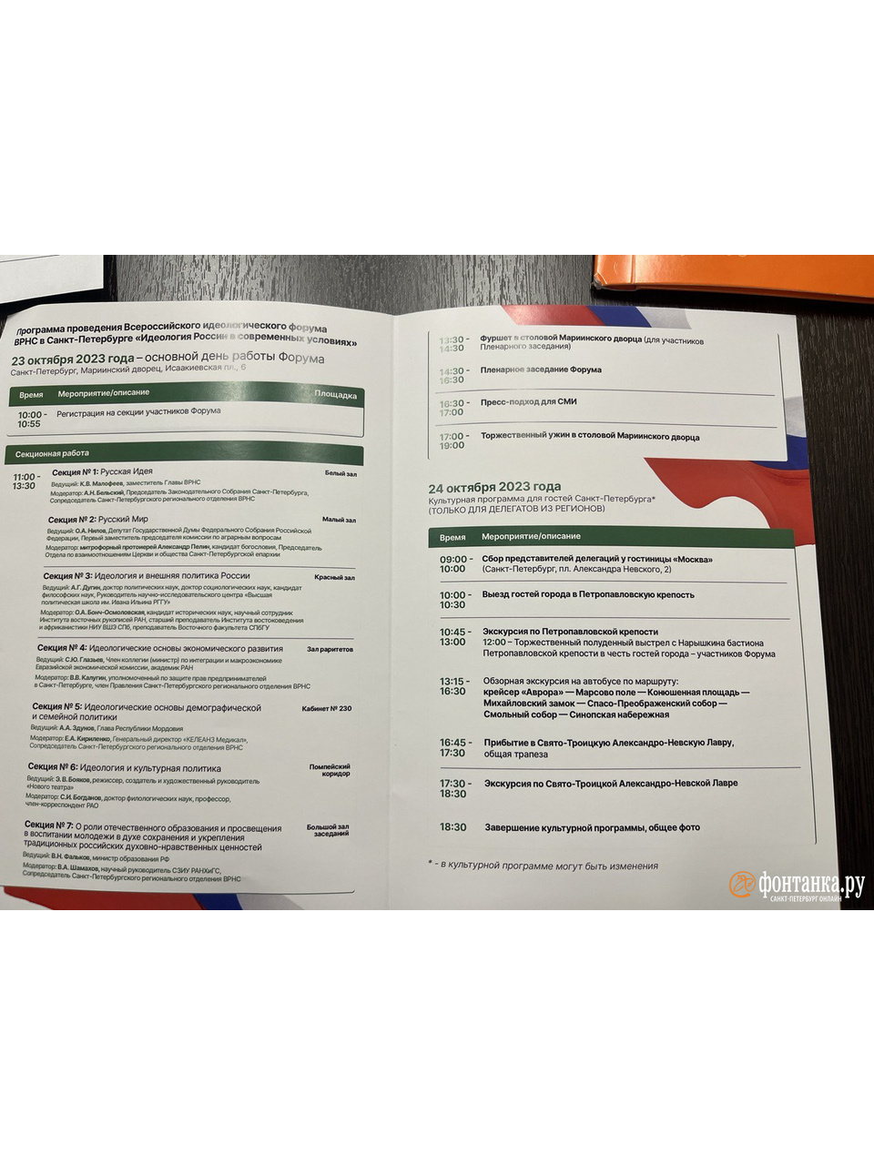 В здании Законодательного собрания Петербурга проходит идеологический форум общественной организации Всемирный русский народный собор. Как стало известно «Фонтанке», 23 октября спикеры будут обсуждать вопросы российской идеологии, а 24 октября поедут на экскурсии.